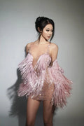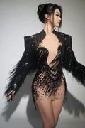 Sparkly Rhinestone Sequin Tassel Coat And Skirt 2Pcs Women Birthday Party Nightclub Dj Stage Performance Costume
