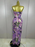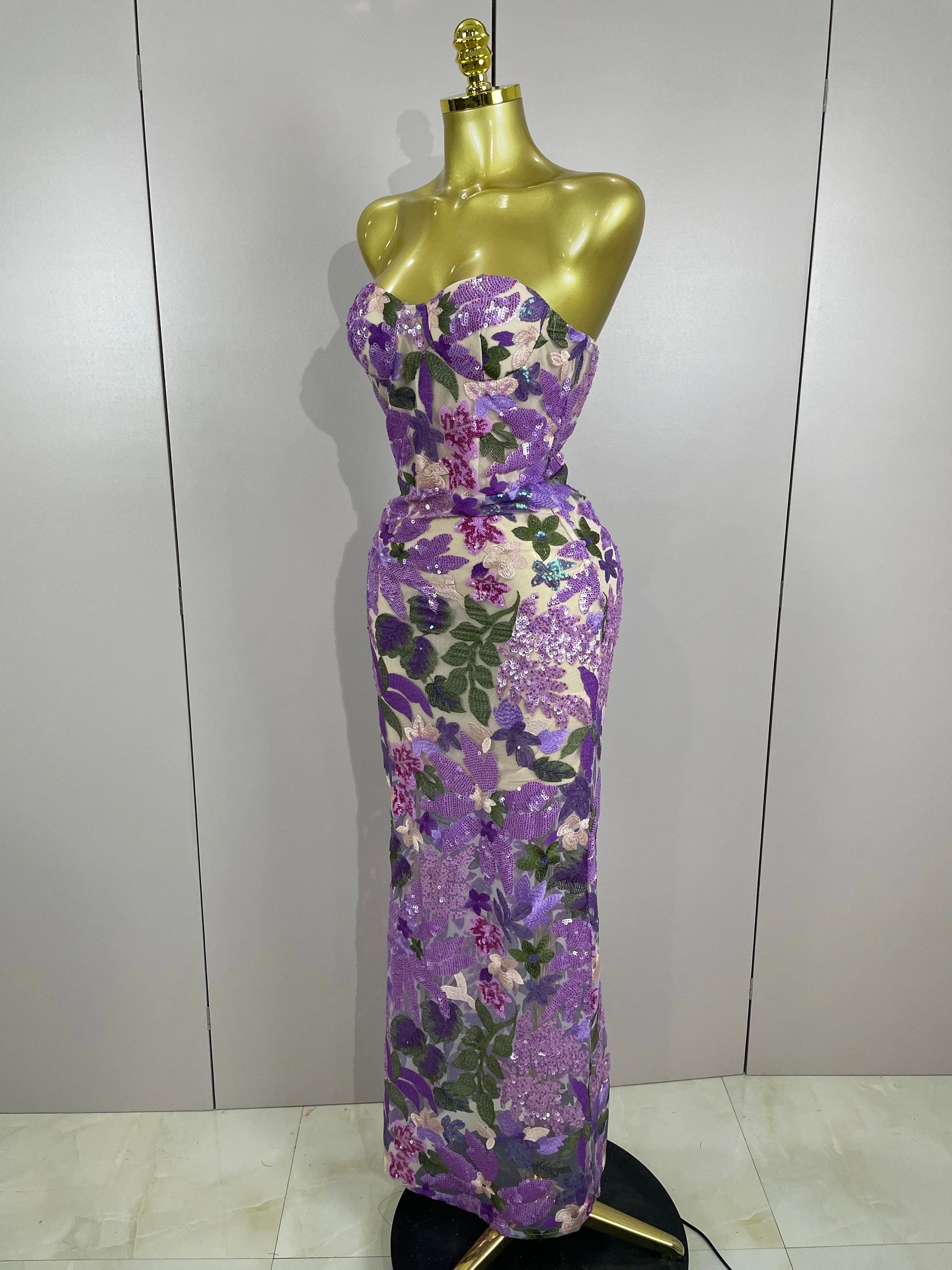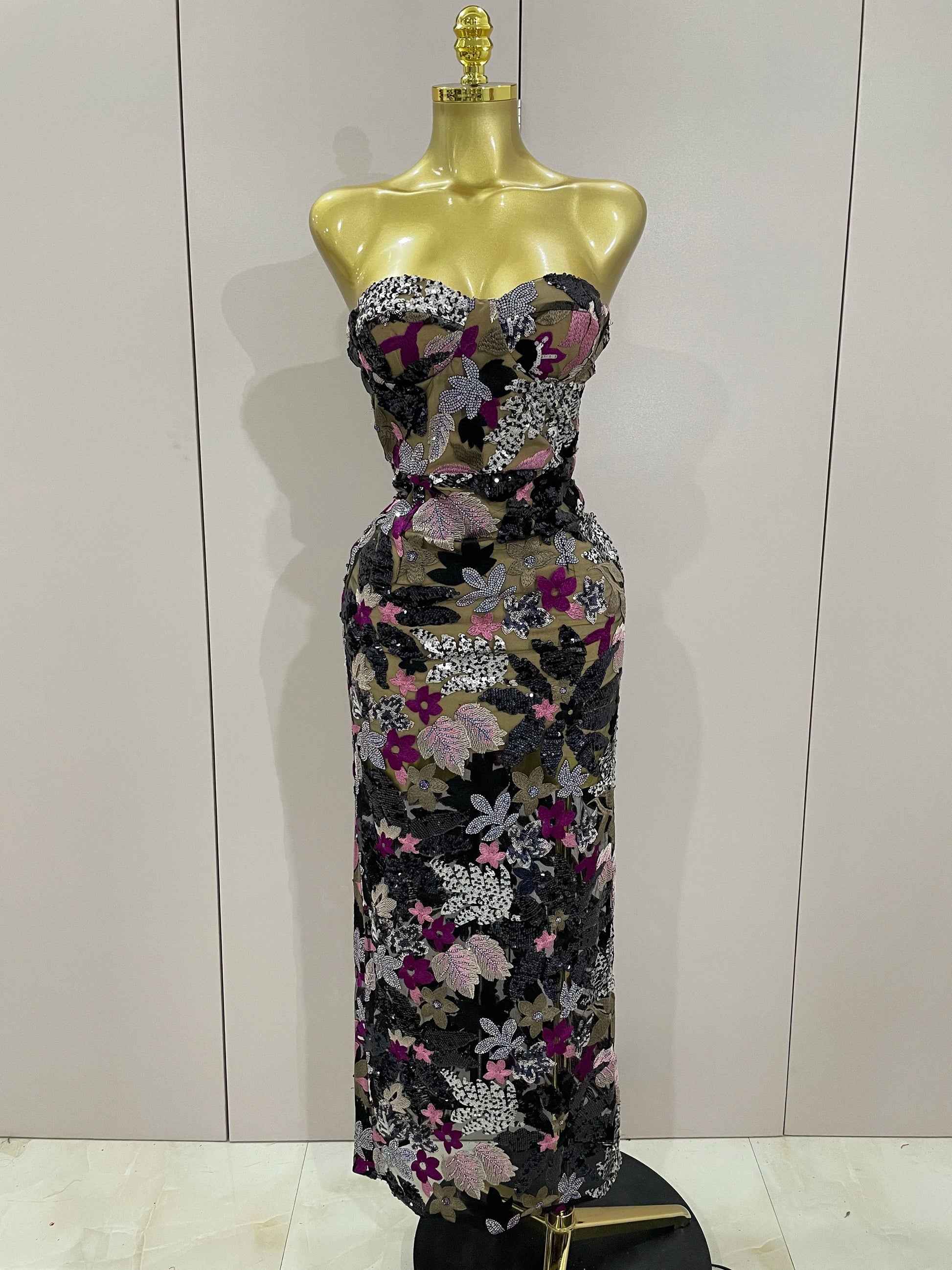 New Sexy Strapless Floral Sequin Long Dress Women Sequins Flower Backless Long Slim Dress Evening Party Runway Gown Dress