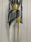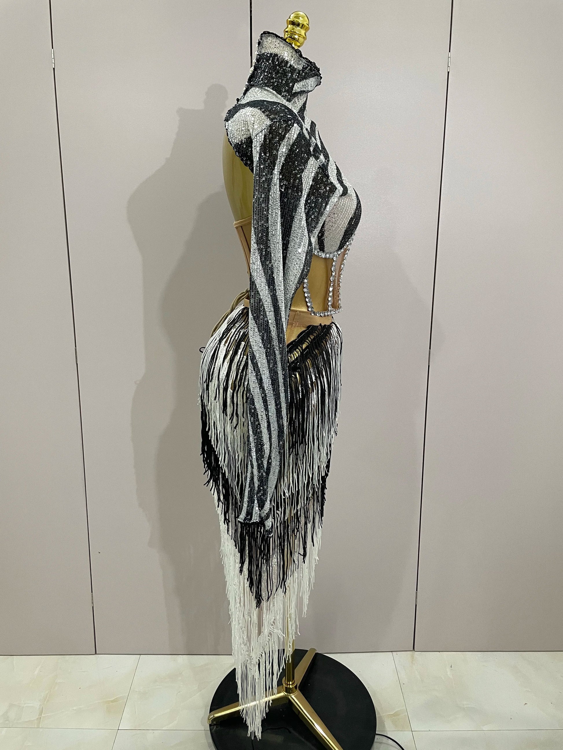 New Shiny Diamond Sequin Tassels Sexy Mesh Long Sleeved Two Piece Set Women Evening Birthday paty Nightclub Stage Costume