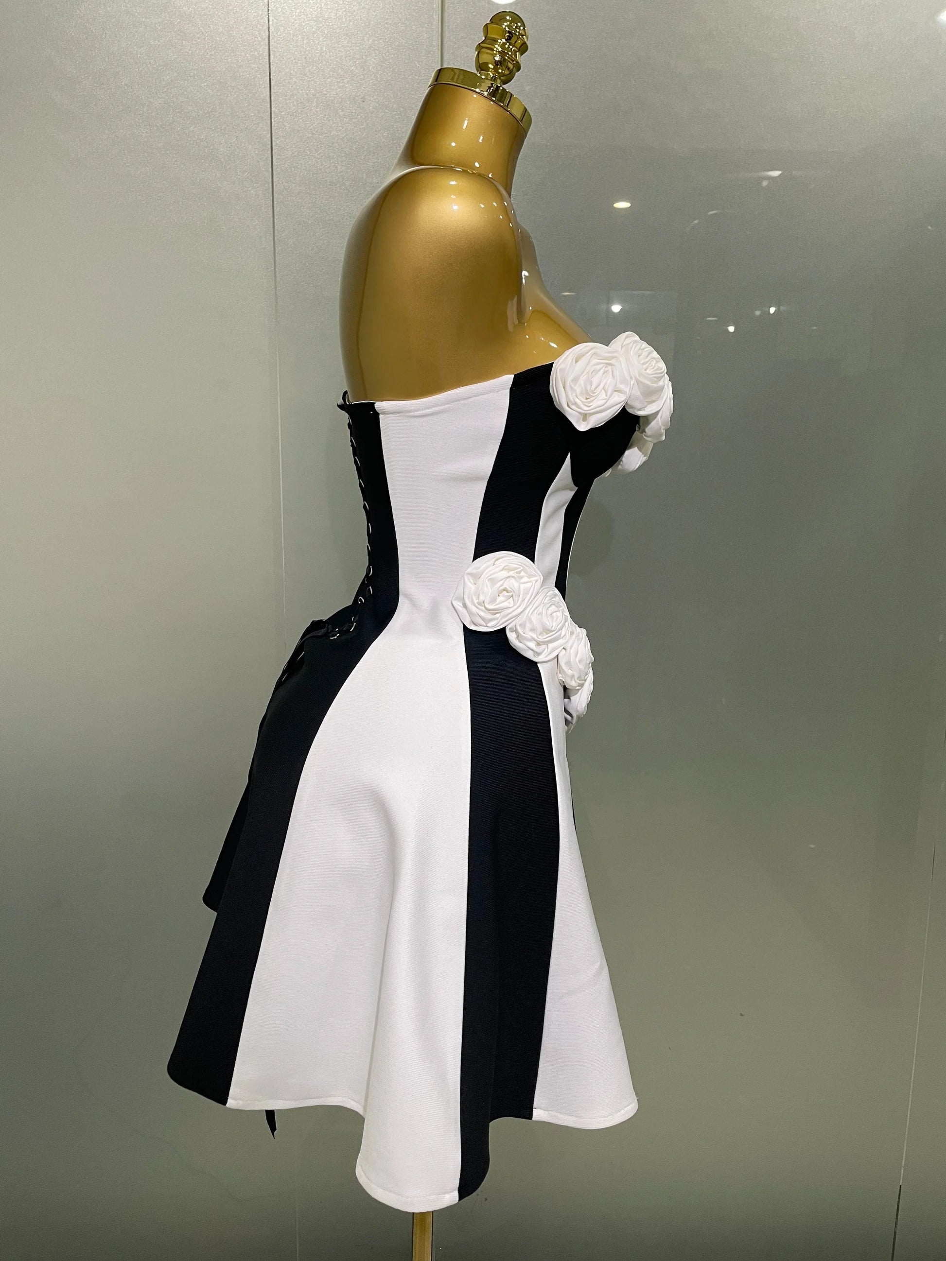 New Women Flower Decoration Strapless Black White Stripe Bandage Short Dress Cocktail Party Elegant Evening Club Party Dress