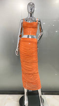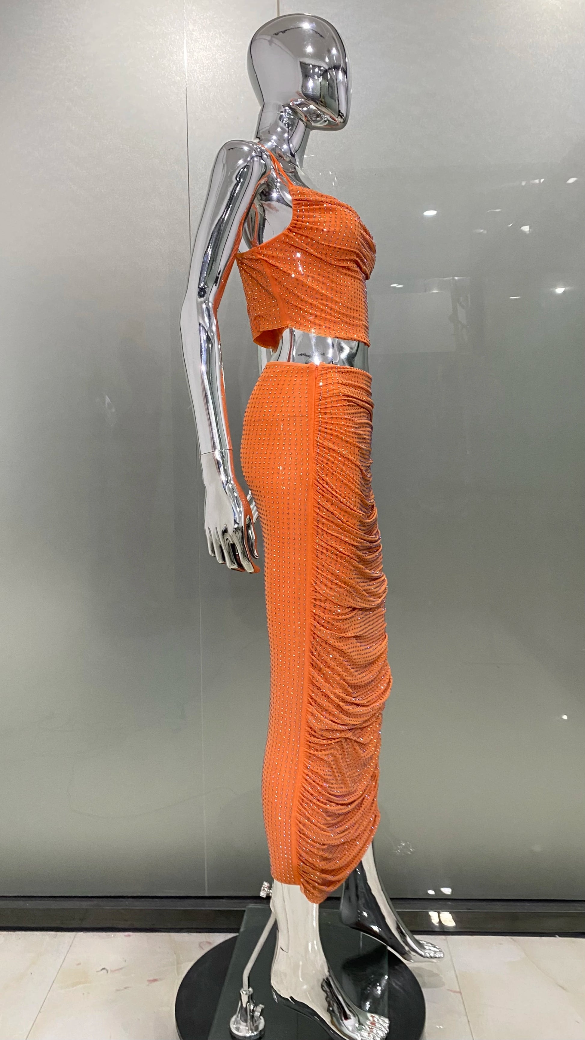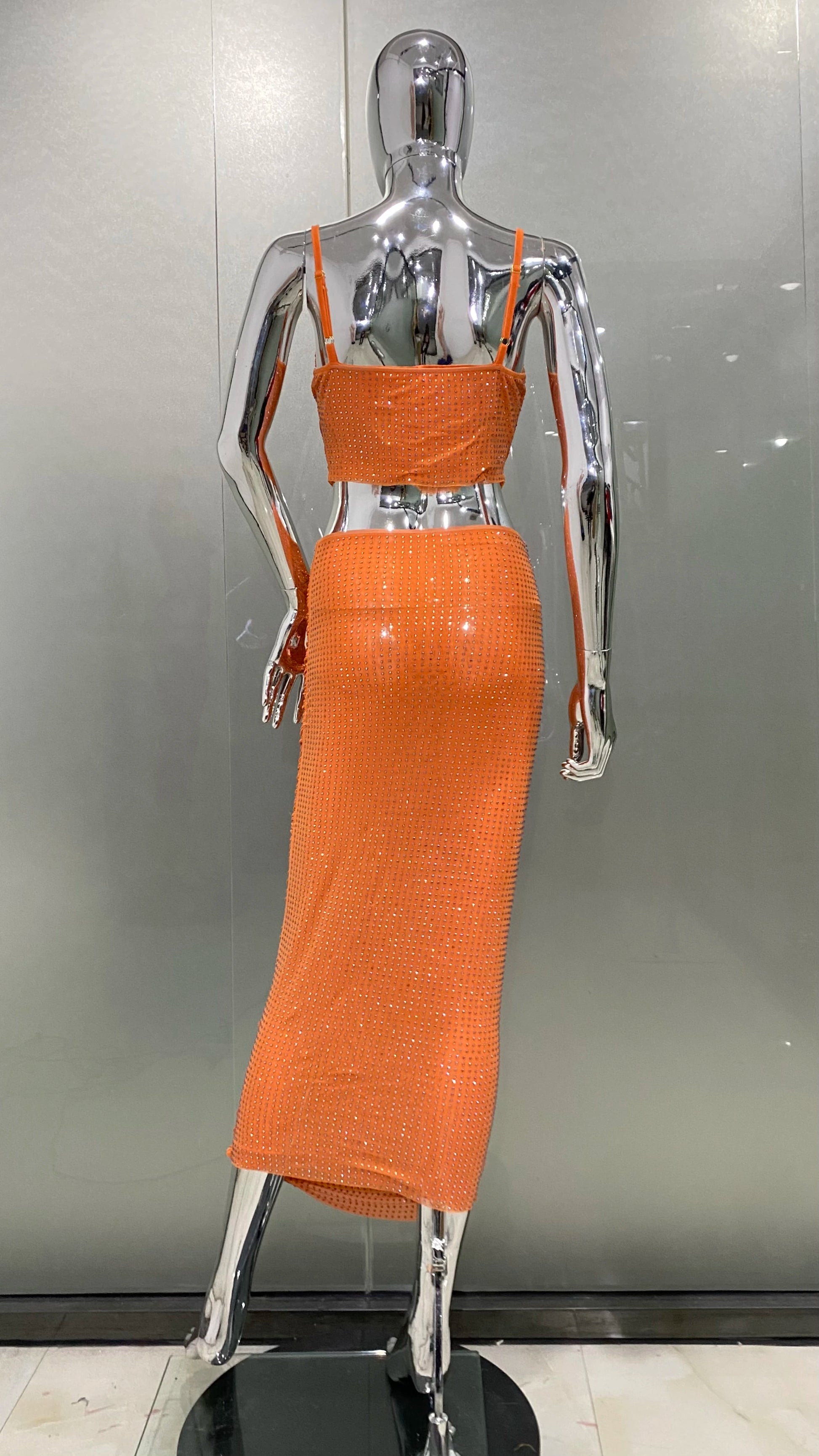 Orange Color Women Sleeveless Sexy 2 Pieces Shinning Rhinestones Bodycon Long Dress Fashion Celebrate Nightclub Party Dress