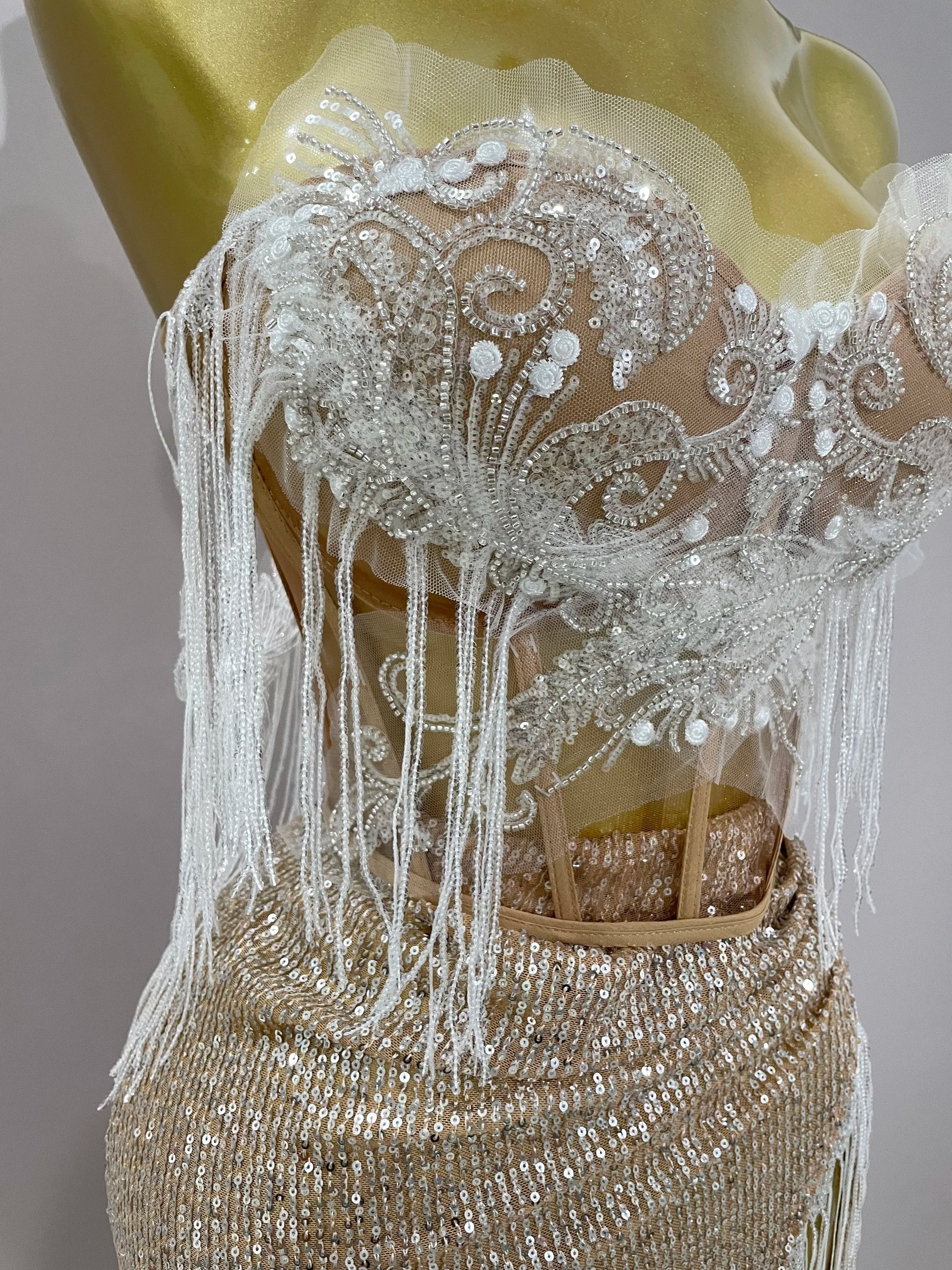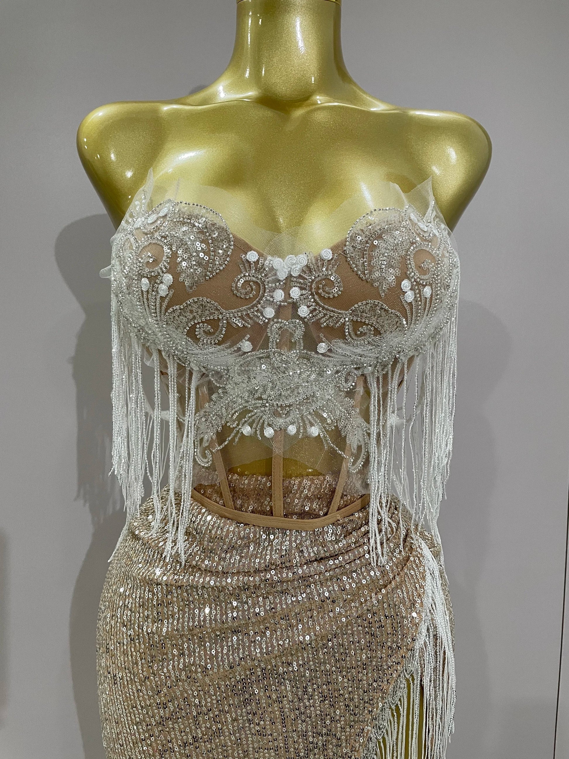 Sexy Luxury Sparkly Sequin Tassel Two Piece Set Women Evening Party Birthday Singer Performan Costume Nightclub Girl Outfit