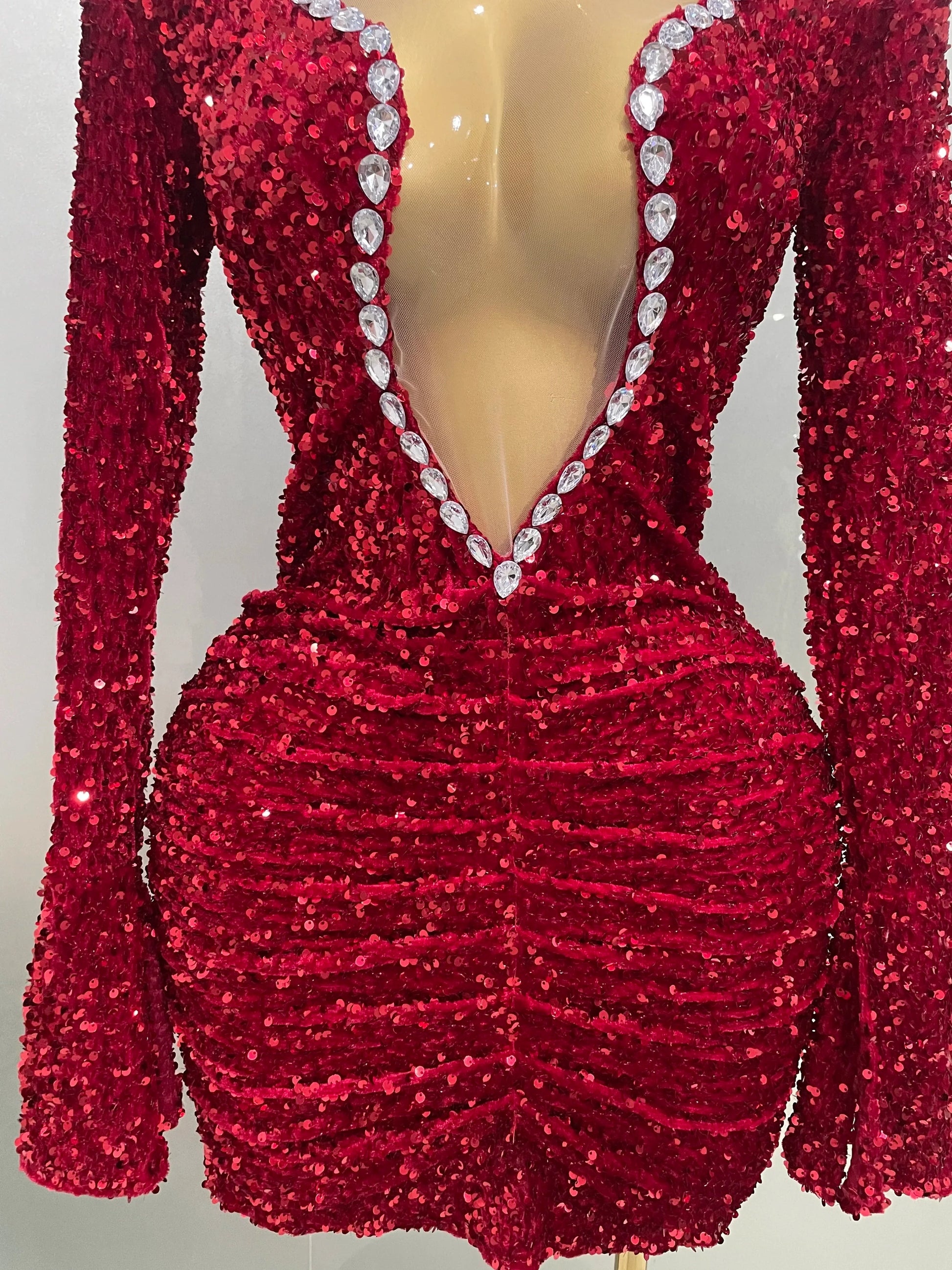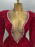 Sexy Shiny Red Sequins Rhinestones Sheath Mini Dress New Women Evening Birthday Party Nightclub Stage Performance Costume