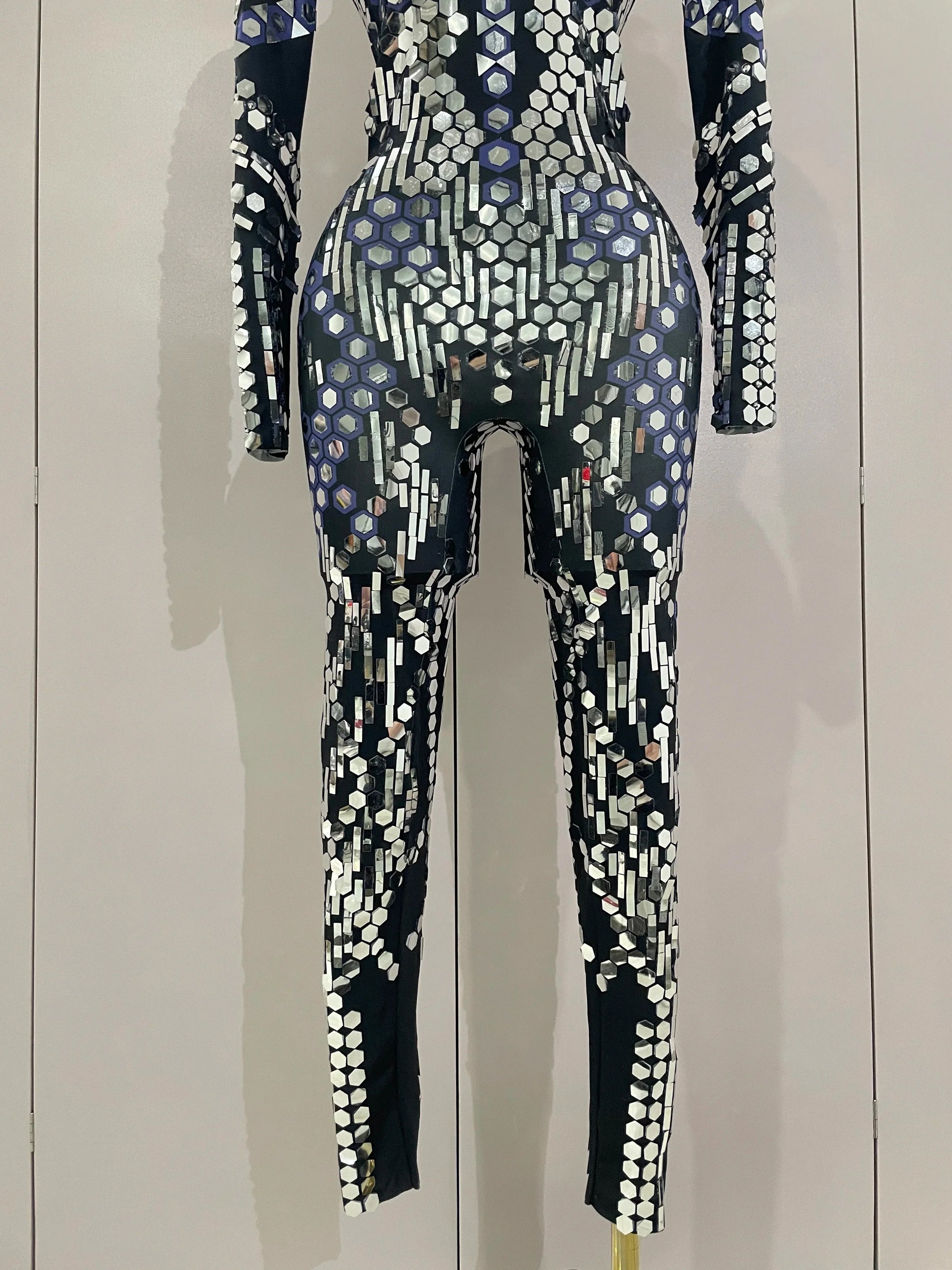 Sexy Shiny Silver Sequins Mirror Black Spandex Jumpsuit Women Prom Dancer Singer Costume Evening Birthday Show Stage Outfit