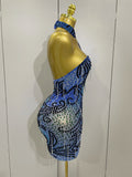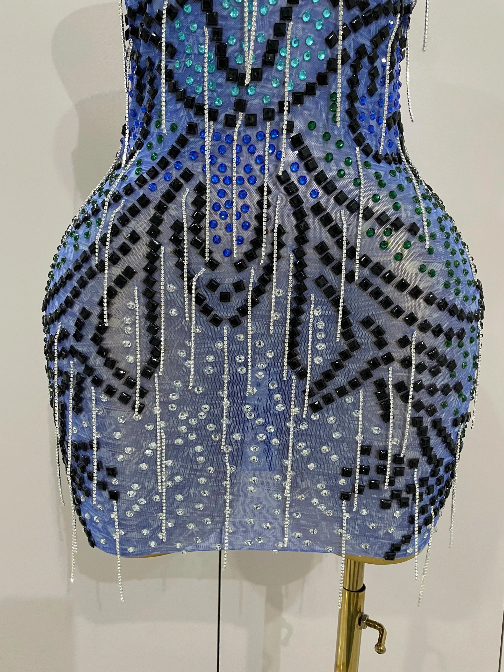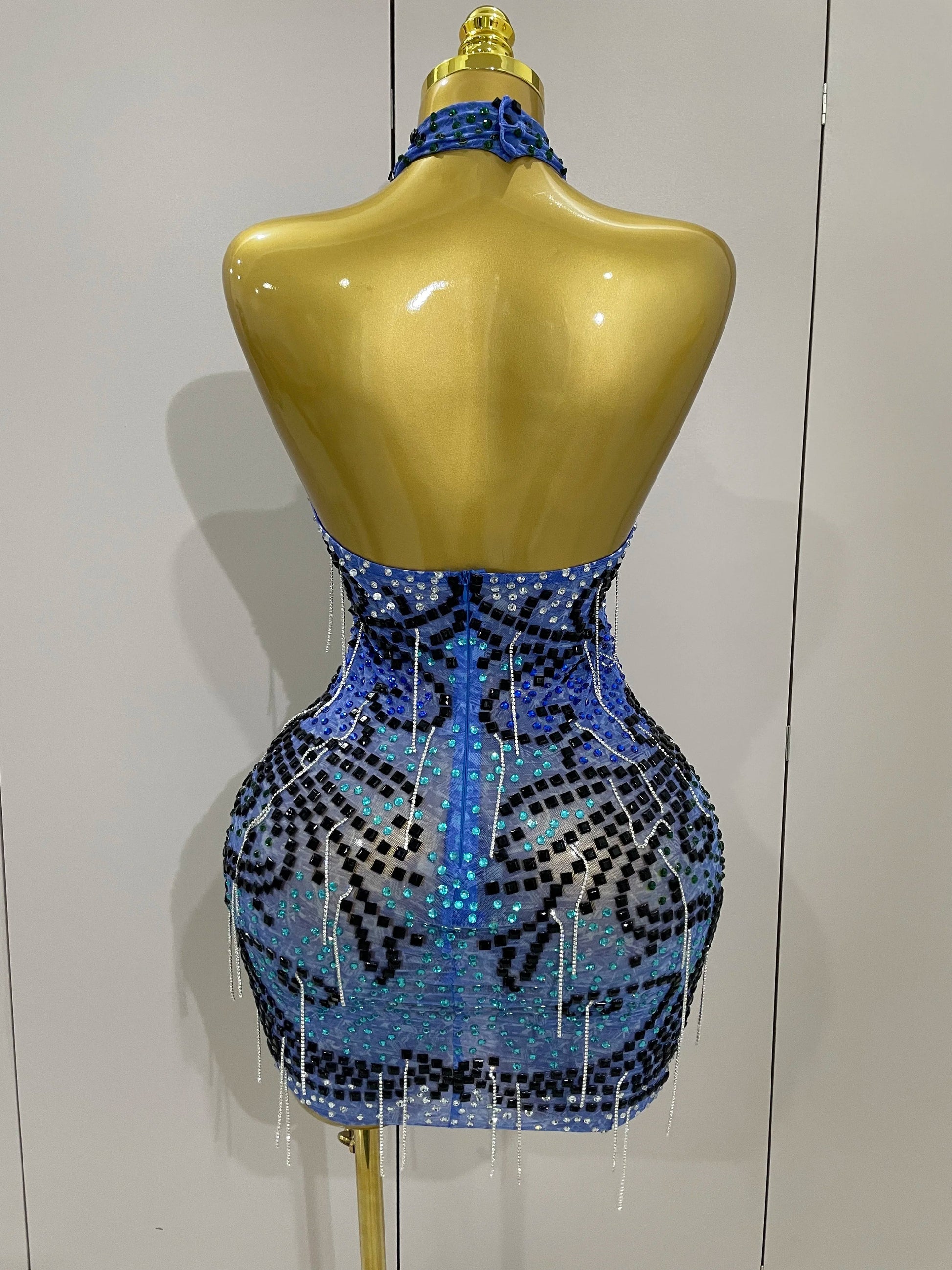 Sexy Sparkly Rhinestones Chains Blue Mesh Short Dress New Women Party Celebrate Birthday Dresses Photo Shoot Stage Wear