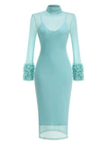 Sexy Turtleneck Ruffle-Cuff Mesh Tight Long Dress Women Long Sleeves Ruffles Bodycon Midi Dresses Evening Party Cocktail Club