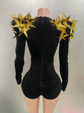 Shiny Gold Rhinestone Black Velvet Long Sleeve Bodysuit Women Evening Party Club Gala Hosts Night Club Bar Stage Costumes