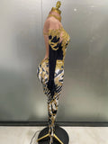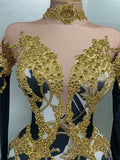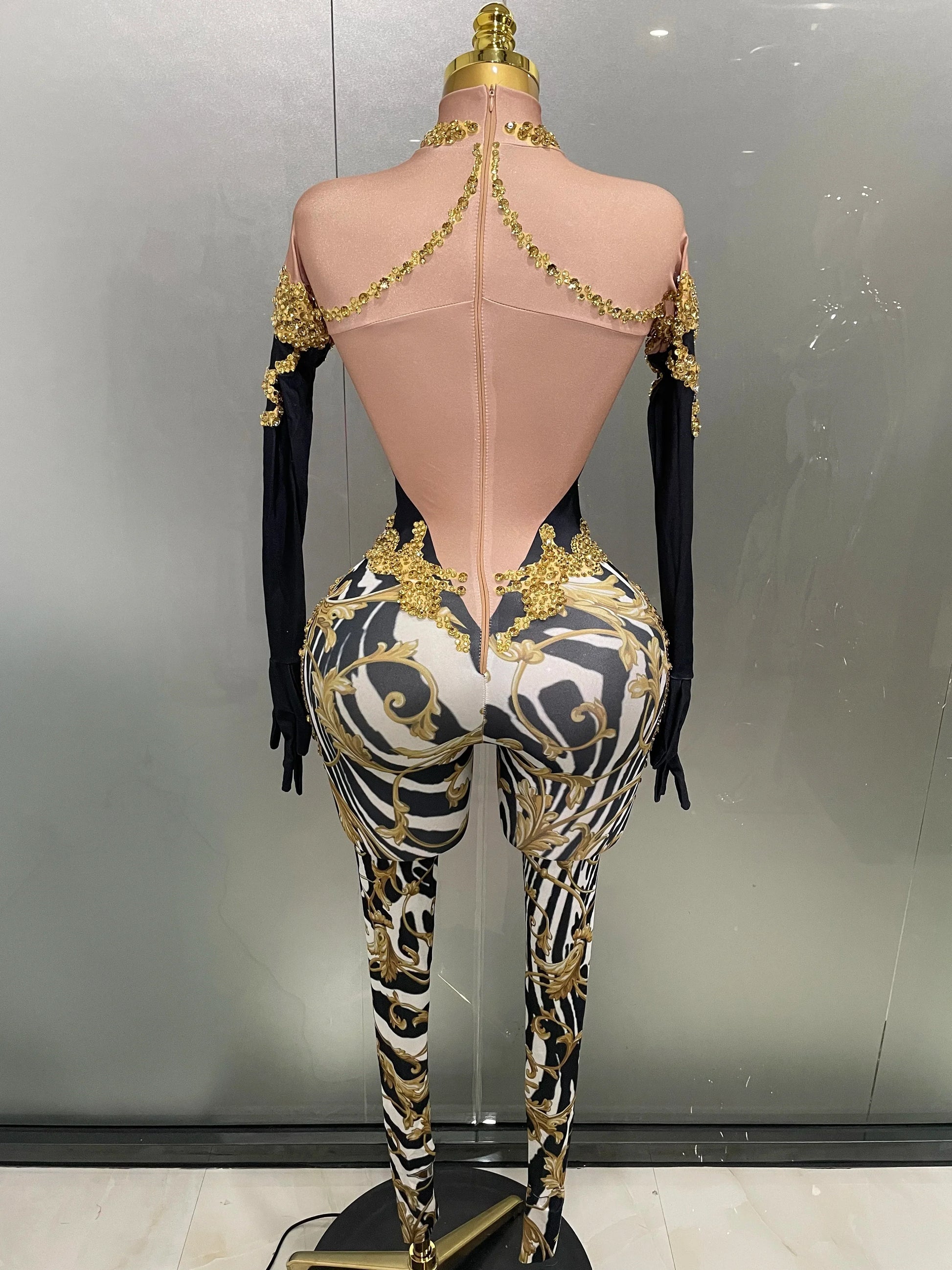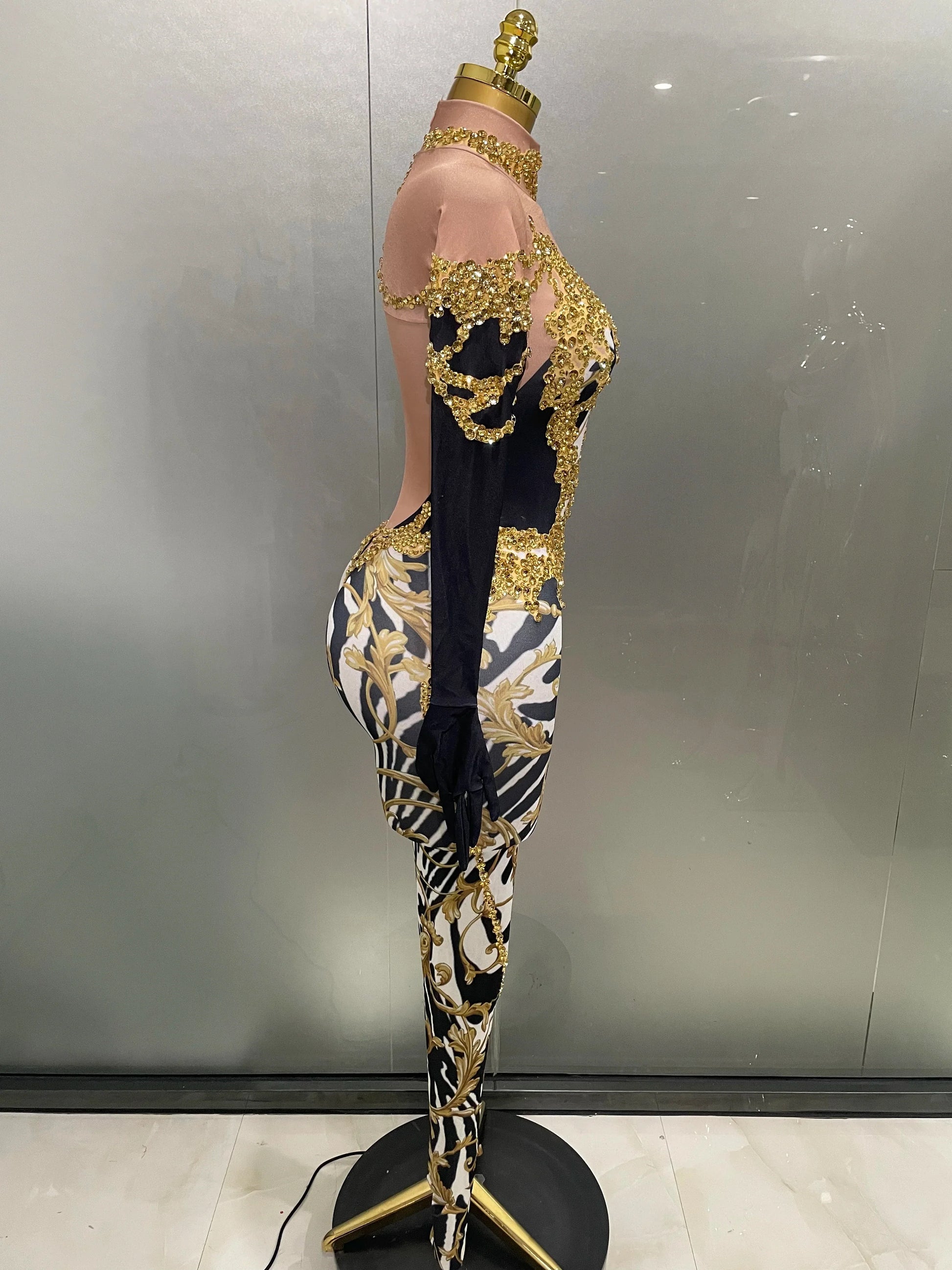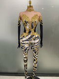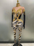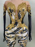 Sparkly Gold Rhinestones Jumpsuit With Gloves New Women Sexy Printed Party Nightclub Bar Singer Stage Performance Costume