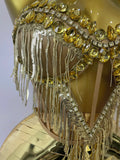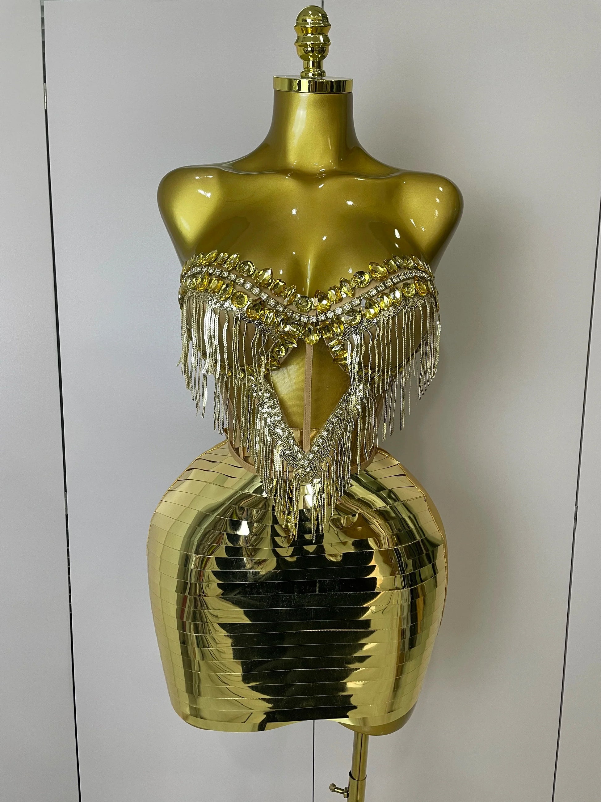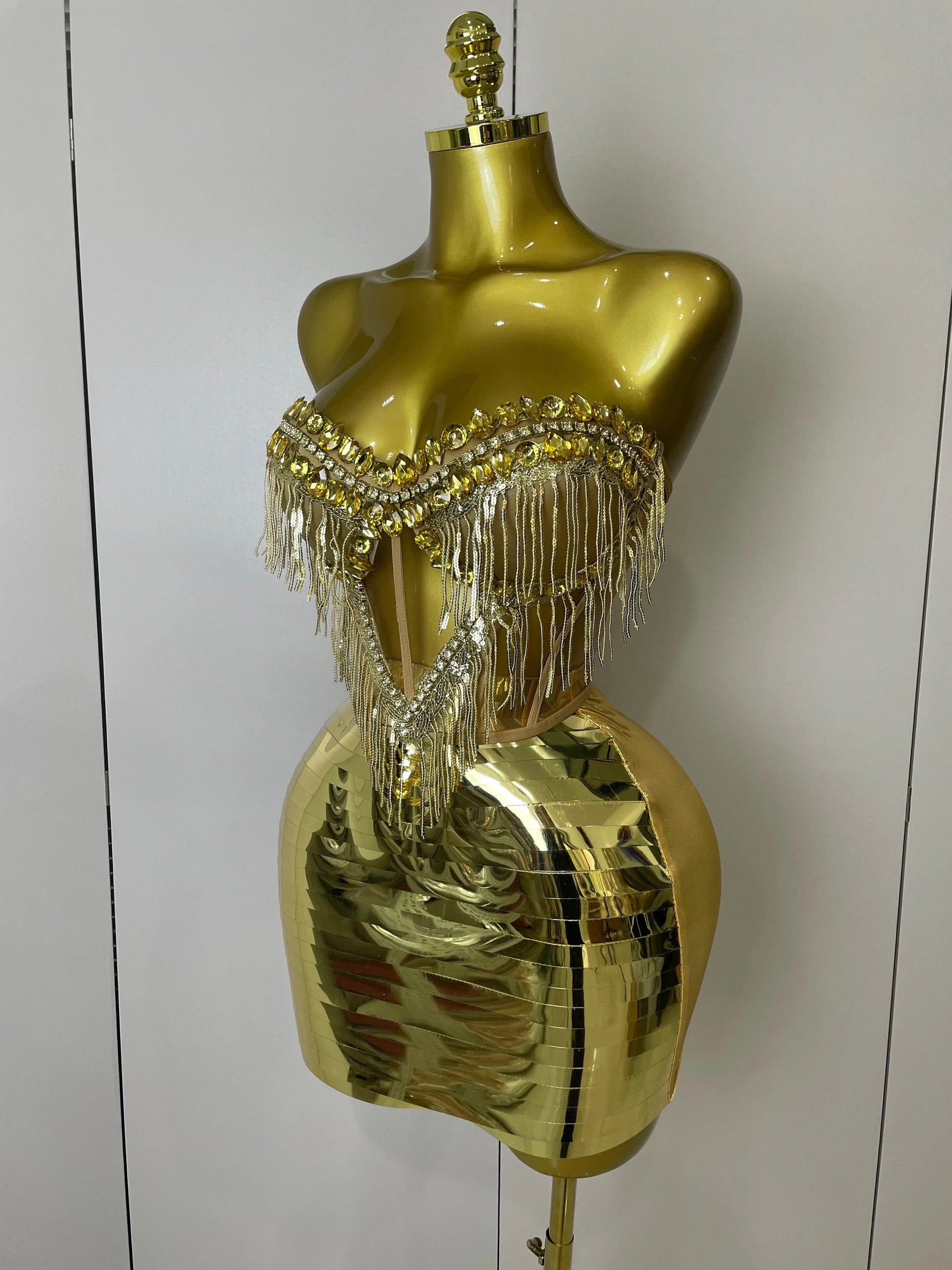 Sparkly Gold Rhinstones tassels Top Skirt Two-piec Set Women Sexy Strapless Designer Nightclub Evening Party Stage Outfit