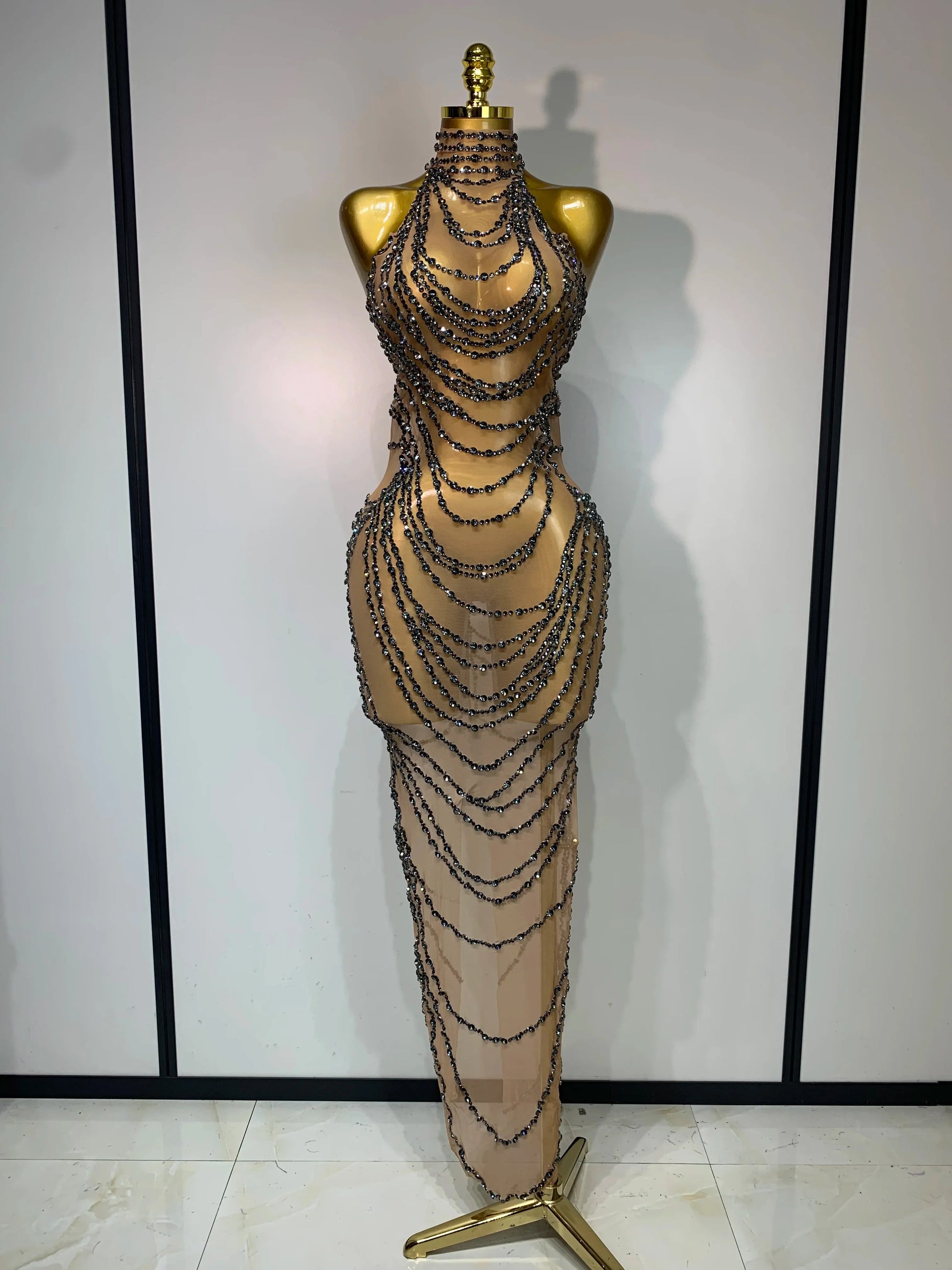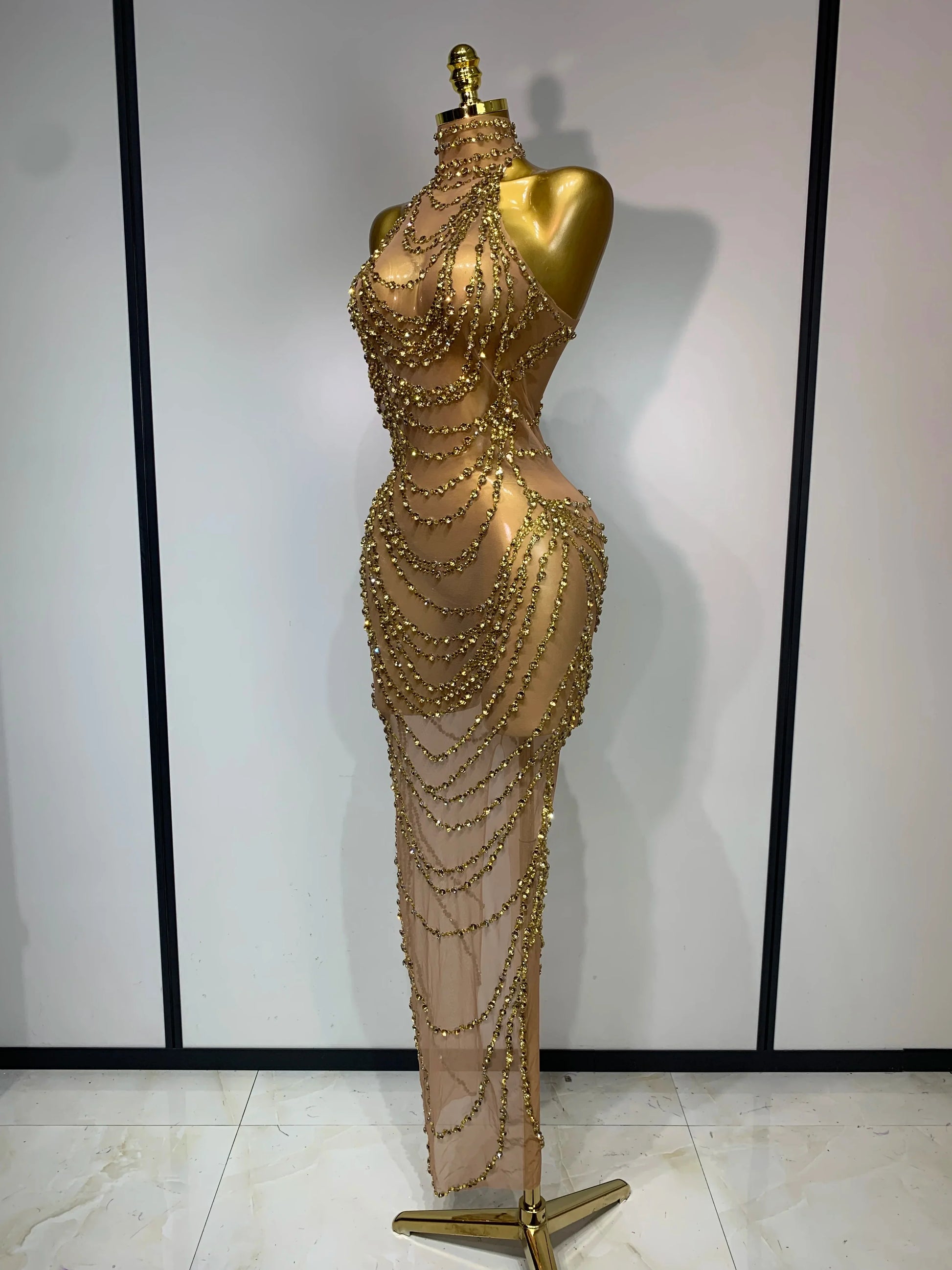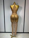 Sparkly Rhinestone Sexy Transparent Mesh Long Dress Women Luxury Birthday Club Party Gown Stage Singer Performance Costume
