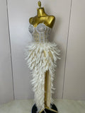 Women Sexy Sparkly Rhinestone Mesh Feather Long Dress Elegant Evening Party Celebrate Birthday Performance Costume