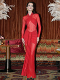 VC Bright Red Ruched Long Dress Diamonds Embellished Long Sleeve Mesh Patchwork Draped Celebrity Evening Party Gown