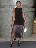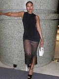VC Glamorous Black Sleeveless Dress with Mesh and Fringe Detail Fashion Evening Gown