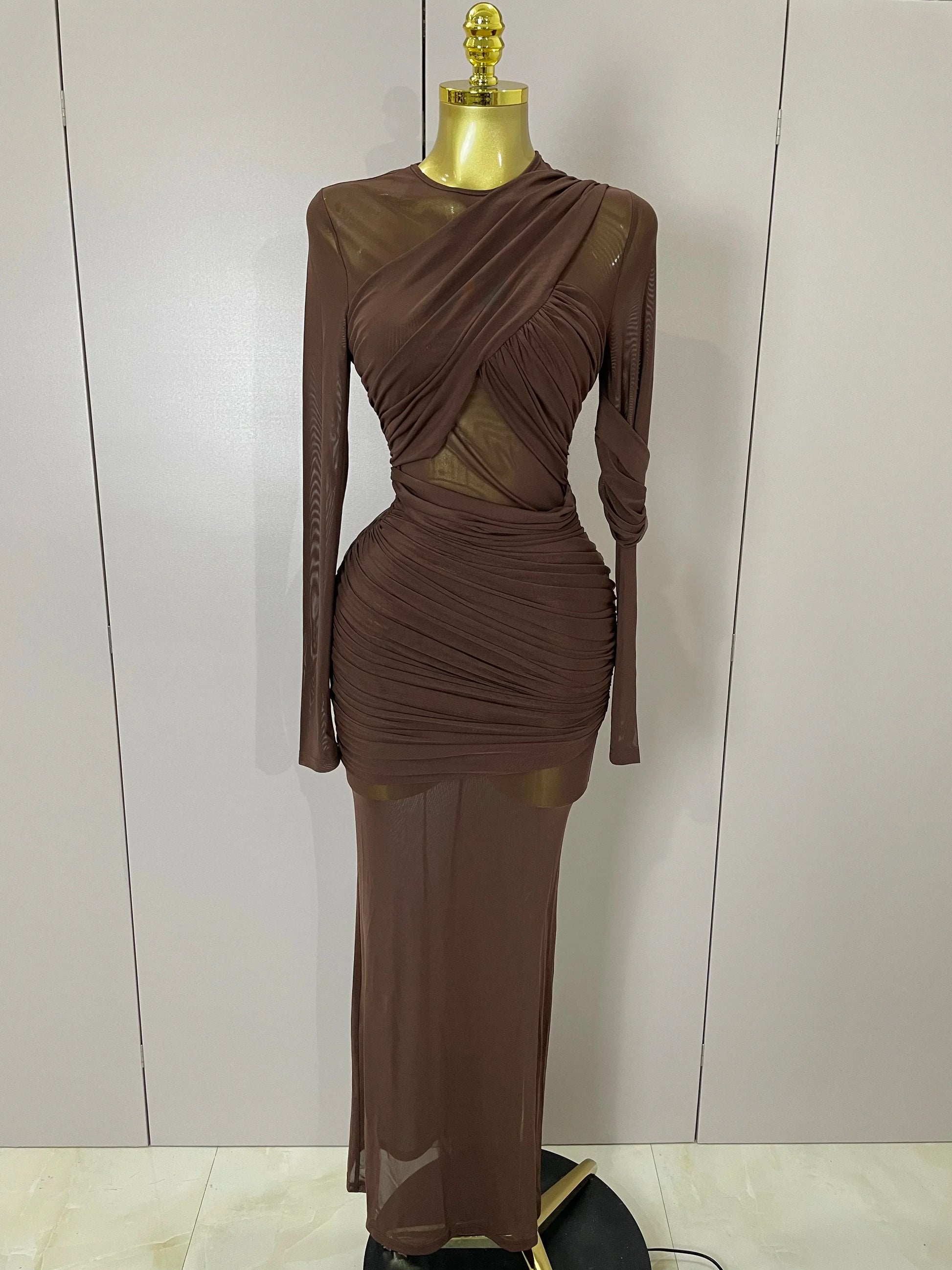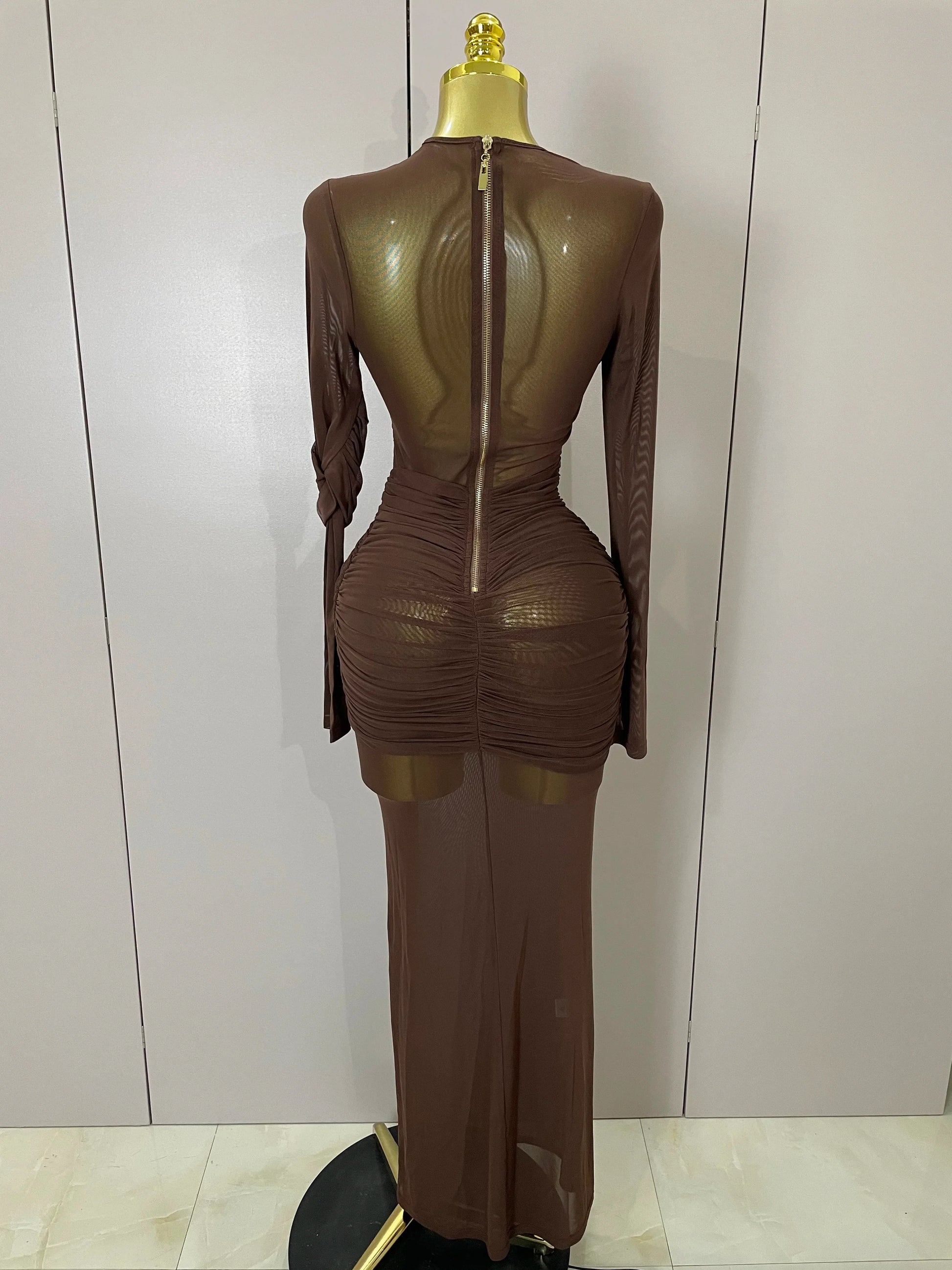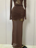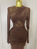 Women Elegant Brown Mesh Fold Long Sleeve Bodycon Dress Evening Party Club Sexy Perspective Fashion Luxury Birthday Dresses