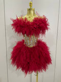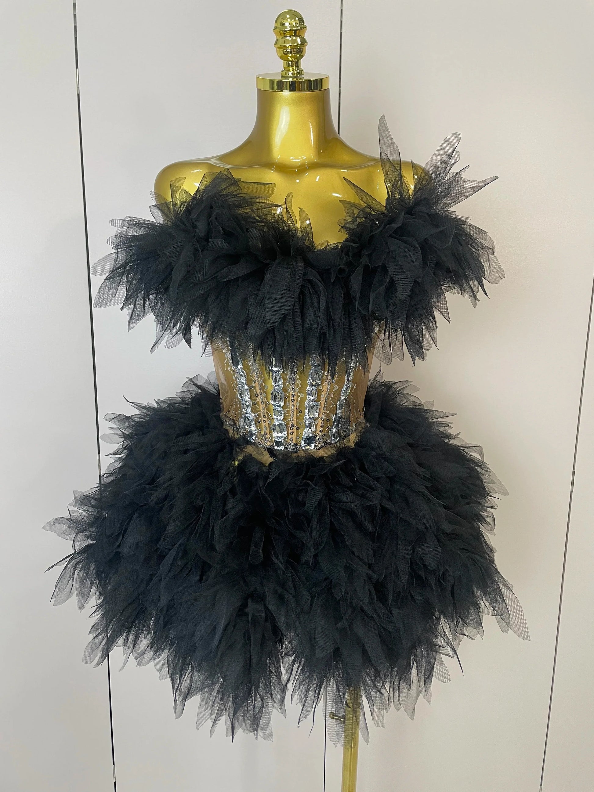 Women Sexy Backless Strap Mesh Fluffy Skirt 2 Pieces Diamond Sequins Stage Performance Costume Birthday Party Shooting Dress