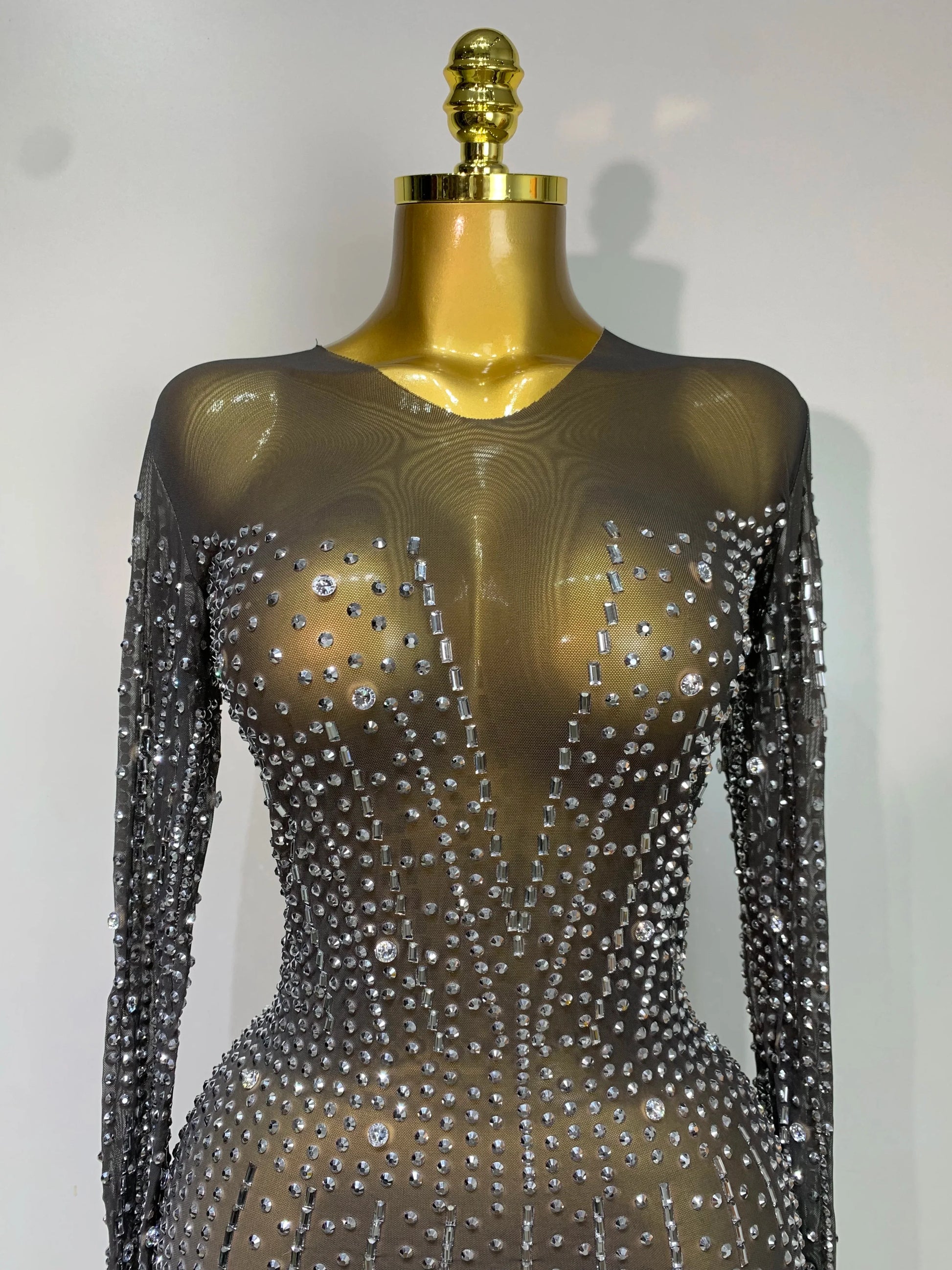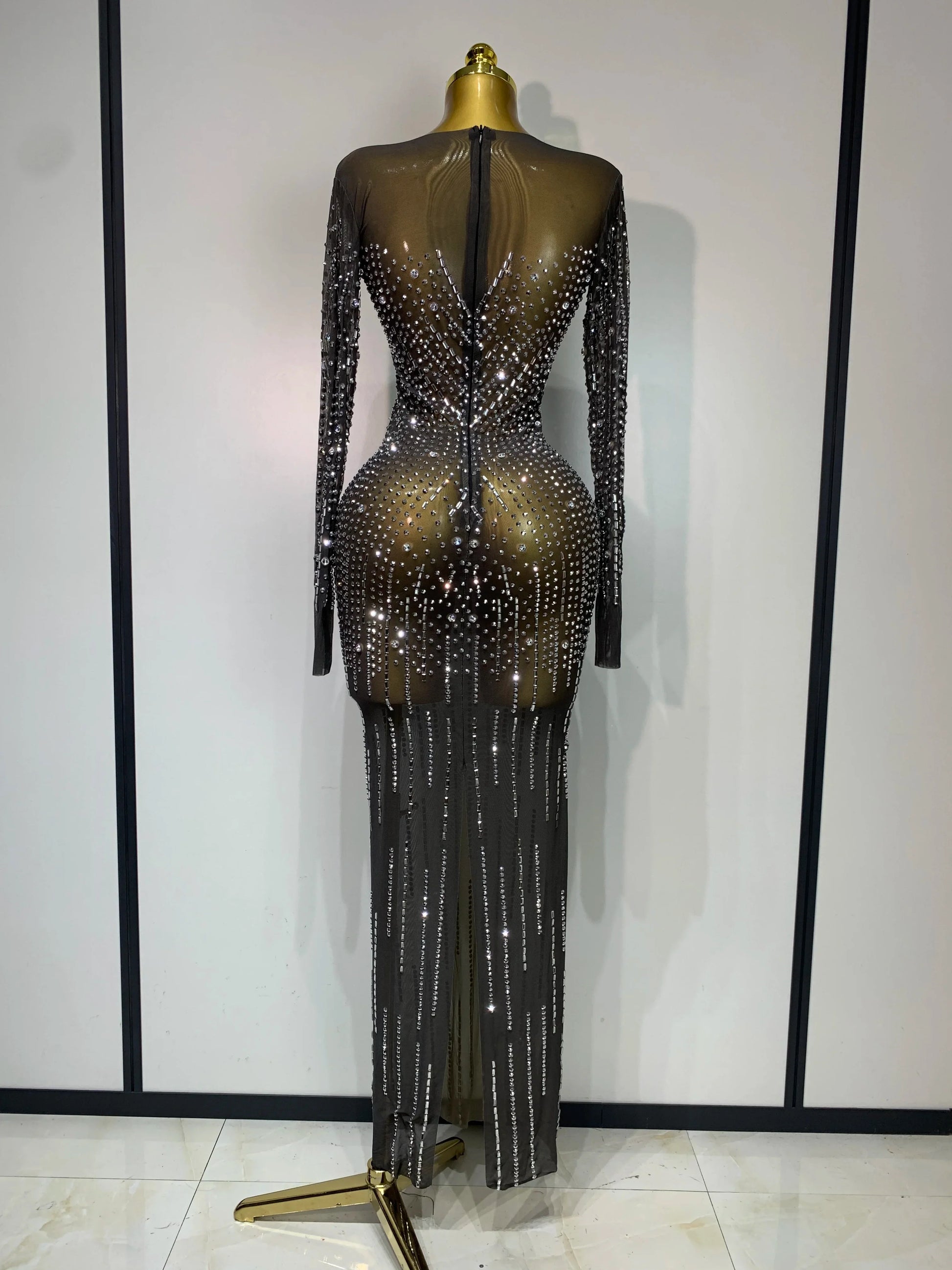 Women Sexy Long Sleeve Mesh See Through Dress Elegant Evening Party Luxury Birthday Club Rhinestone Performance Costume