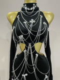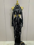 Women Sparkly Diamonds Tassels Chain Balck Sexy Halter Backless Long Dress Evening Birthday Party Celebrate Stage Costume