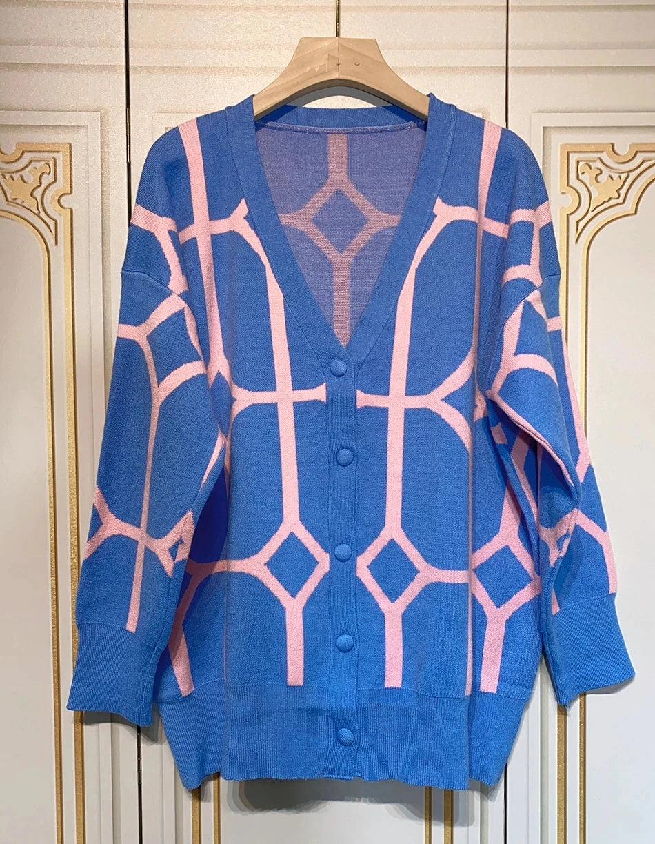 Women's Casual Oversized Cardigan Knitted 2023 Fall New V-neck Lantern Long Sleeve Single-breasted Printed Knit