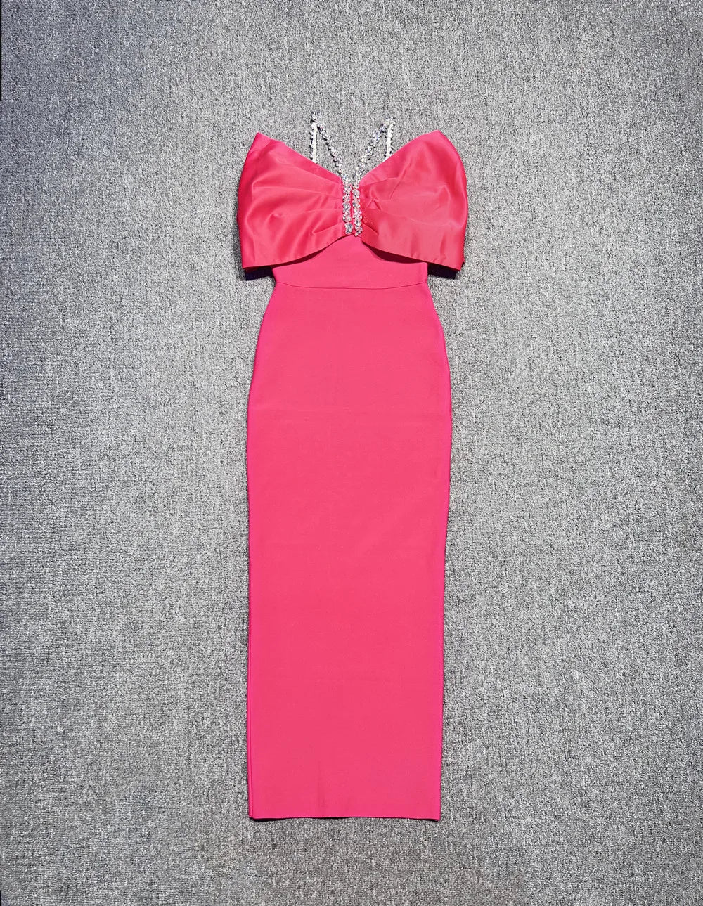 2025 New Fashion Rosered Color Women Sexy Off the Shoulder Bodycon Long Bandage Dress Nightclub Party Celebrate Dress