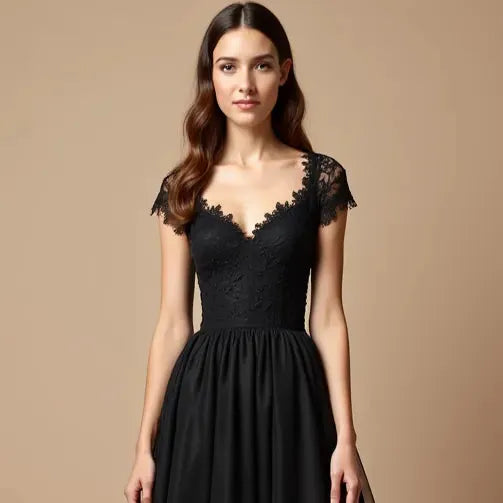 Regardless of the color you select for your dress, the white, black, or ivory lace accents will remain consistent. This applies to designs where the bodice and skirt are in different colors, maintaining a harmonious and sophisticated aesthetic.