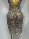 Celebrity Elegant Party Sparkly Rhinestones Transparent Mesh Short Dress Luxury Birthday Nightclub Outfit Perform Stage Costume