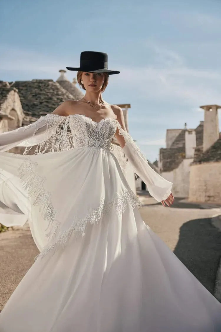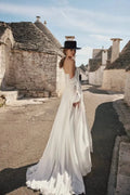 Dreamy Beach Wedding Dress with Long Sleeves, Sweetheart Neckline & Delicate Lace Details for a Romantic and Effortlessly Elegant Bridal Look