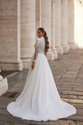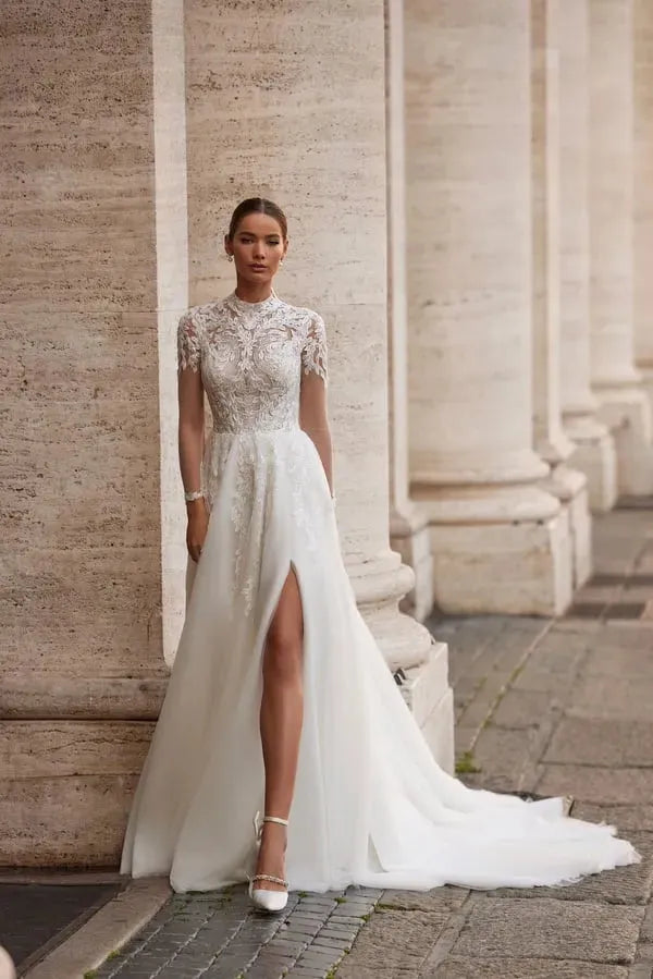 Elegant A-Line Wedding Dress with Illusion Sleeves, High Neckline, and Exquisite Embellishments