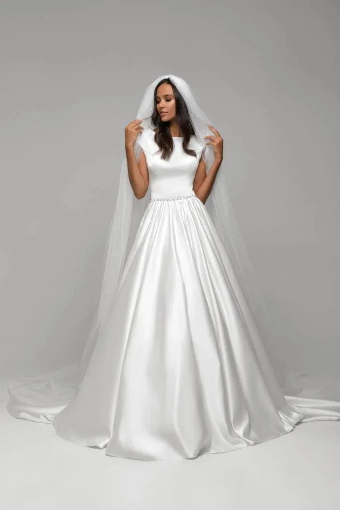 Elegant A-Line Wedding Gown with Cap Sleeves, Boat Neckline, and Lace Embellishments for a Classic Bridal Look