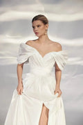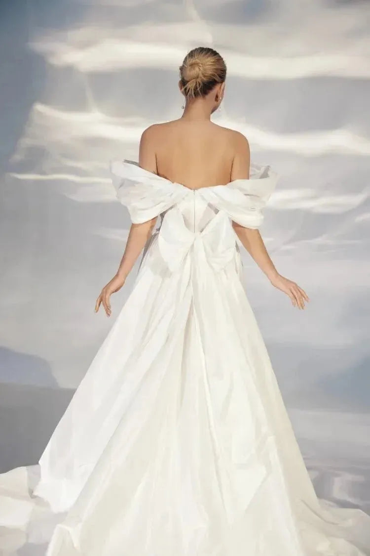 Elegant A-Line Wedding Gown with Off-the-Shoulder Sweetheart Neckline, Bant Embellishment, and a Flattering Natural Waistline – Romantic Puffy Bridal Dress