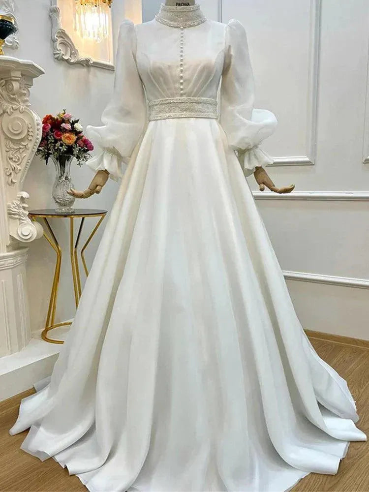 Elegant Muslim Wedding Dresses for Bride A-Line Organza Robe De Mariée Full Sleeves Dubai Arabic Bridal Gowns