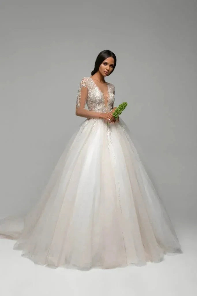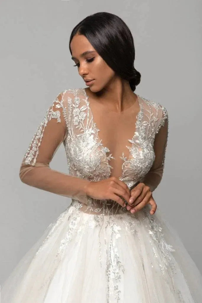 Elegant Puffy A-Line Wedding Gown with Long Sleeves, V-Neckline, and Lace Embellishments for a Graceful Bridal Look