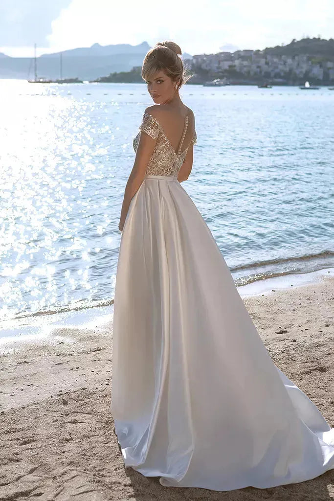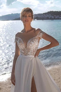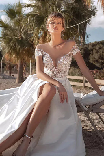 Ethereal A-Line Wedding Gown with Delicate Cap Sleeves, a Romantic Off-Shoulder Neckline, for a Timeless and Enchanting Bridal Look