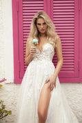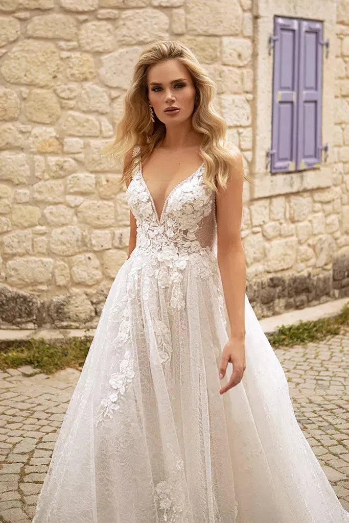 Ethereal A-Line Wedding Gown with Delicate Spaghetti Straps, a Flattering V-Neckline for a Romantic and Timeless Bridal Look
