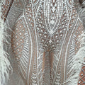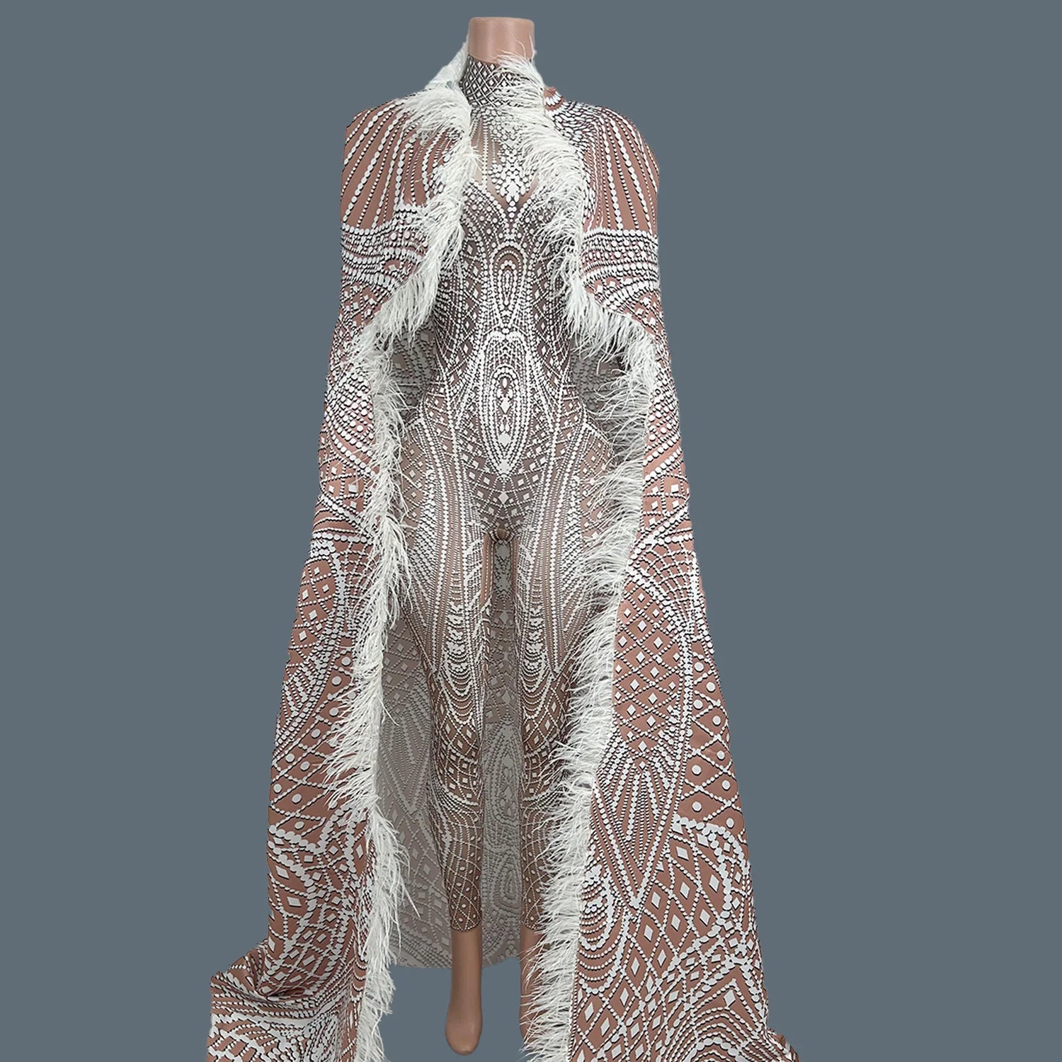 Fashion White Printed Tight Jumpsuit with Feather Long Cloak Unisex Stage Performance Dance Costume Set for Men And Women Xuenv