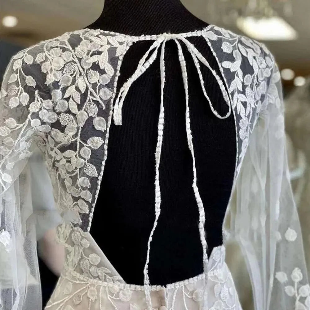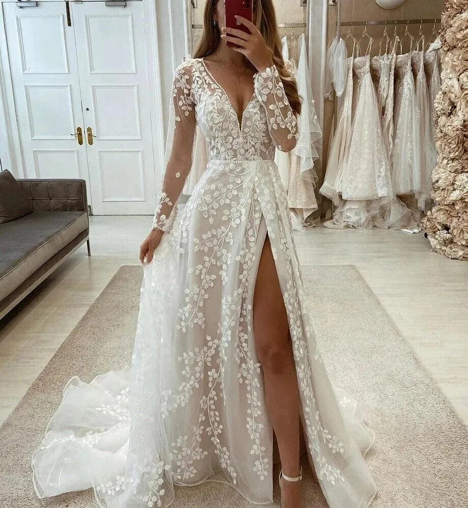 Gorgeous V Neck Long Sleeves Wedding Dresses Lace Applique Bride Gowns Sexy Split Tulle A Line Sweep Train Vestidos De Novia