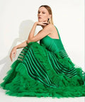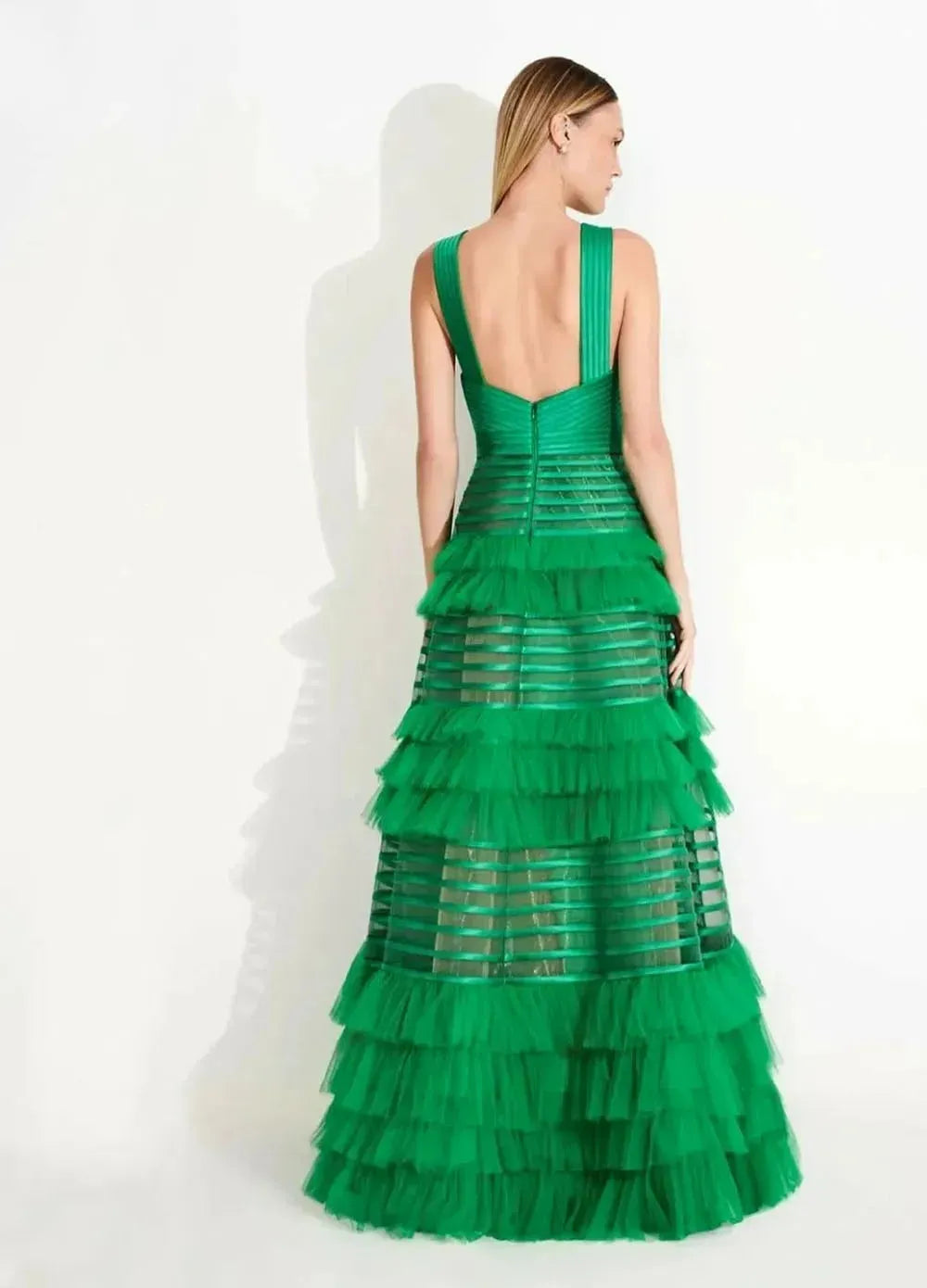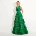 Green Prom Dresses V-Neck Sleeveless Tiered Ruffles Tulle Pleat Ruched A-Line Evening Gowns Special Occasion Gown