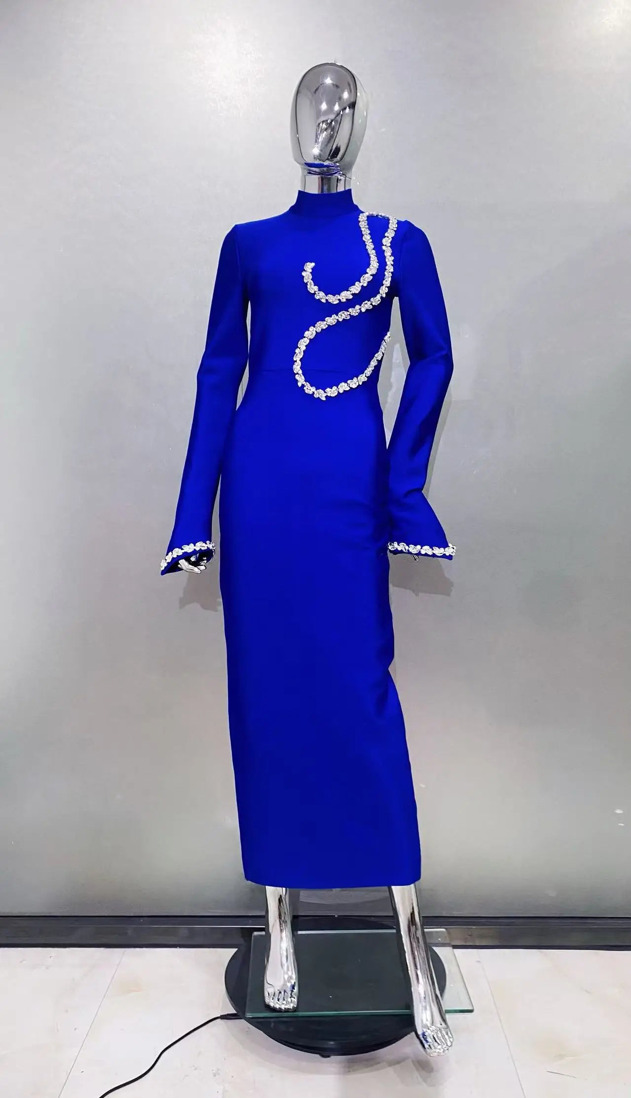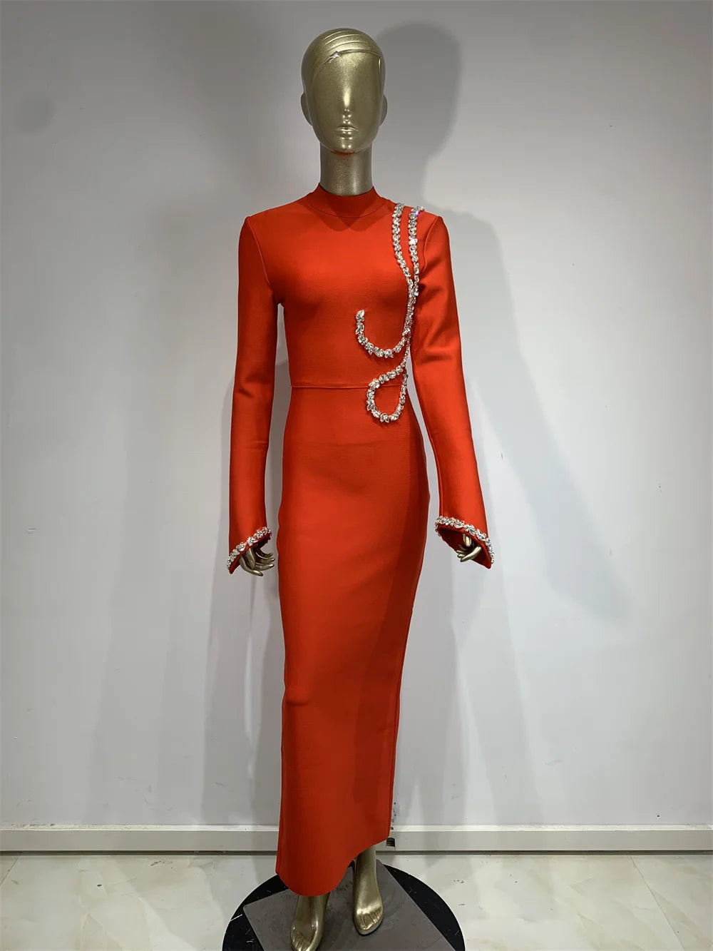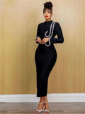 Women Long Sleeve Sexy Shinning Crystal Bodycon Long Bandage Dress Celebrate Evening Party Nightclub Outfit Wear