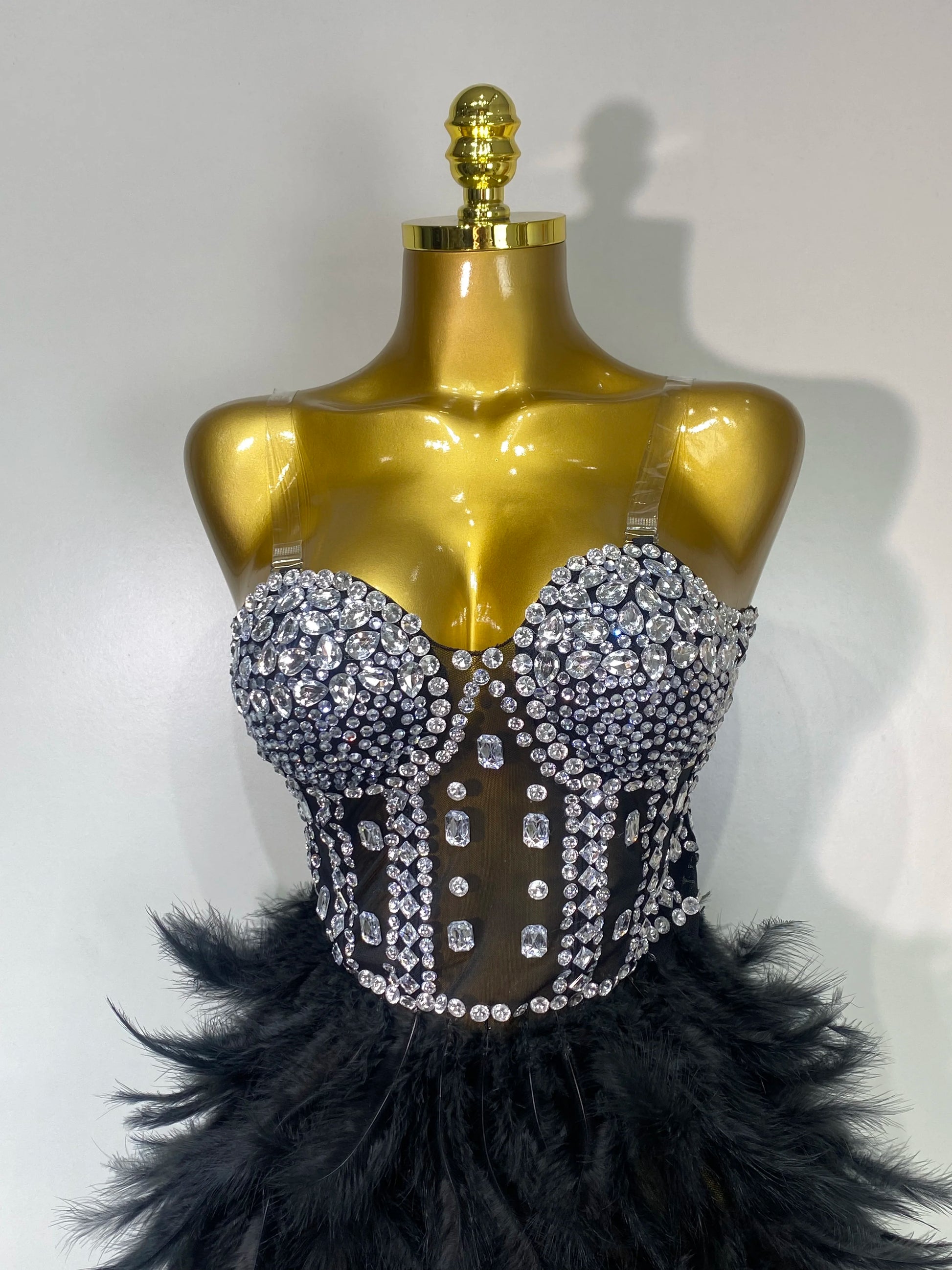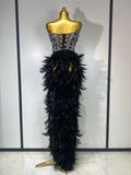 Luxury Birthday Evening Party Long Dress Women Sexy High Slit Backless Gowns Diamonds Feather Patchwork Stage Perform Costume