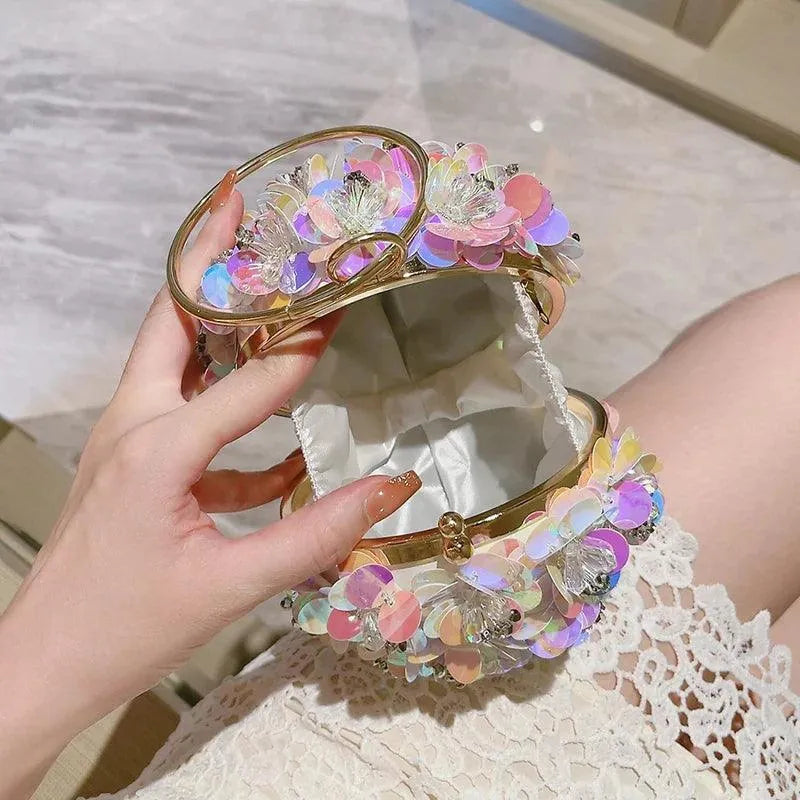 Mini Sequin Floral Clutch Bag, Elegant Round Evening Bag, Women's Formal Dinner Purse For Wedding Party & Prom