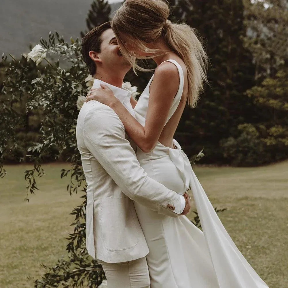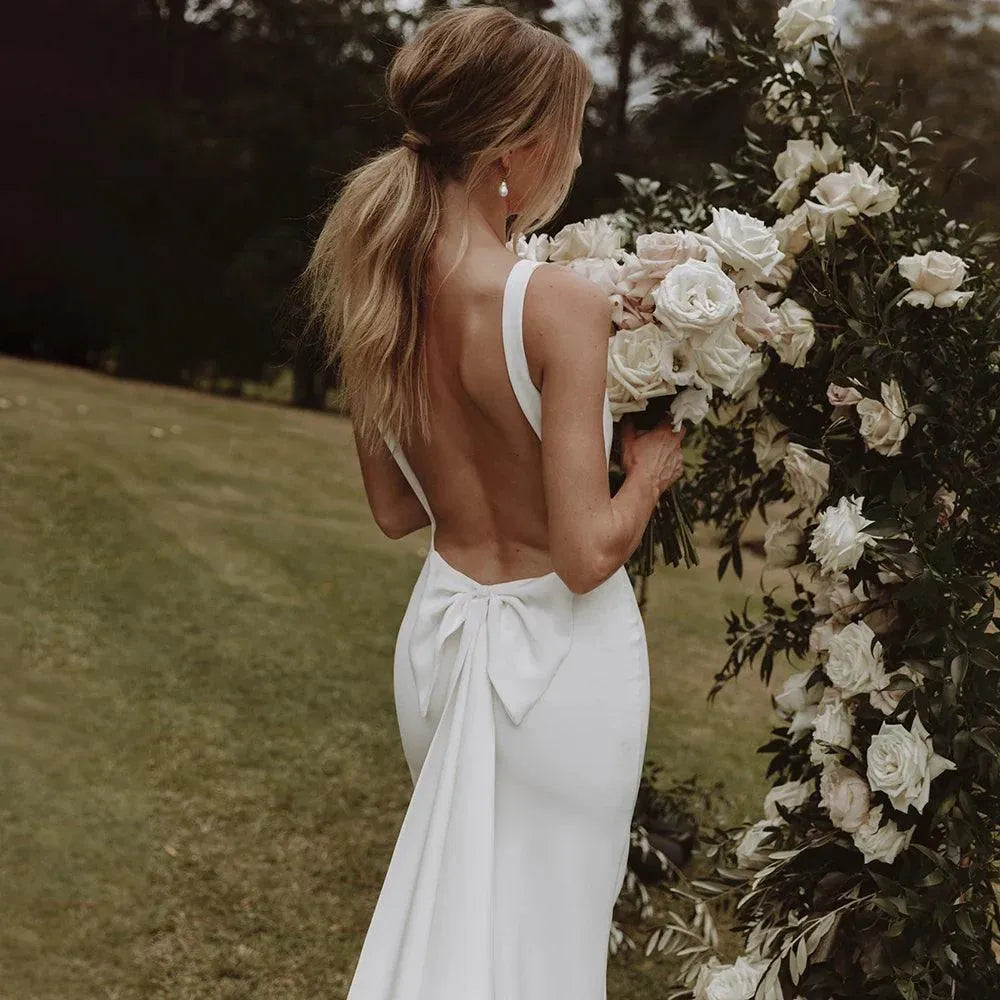 Modern Sheath Crepe Minimalist Wedding Dresses For Women Buttons Oversized Tight Fit Simple Bow Train Backless Bridal Gown