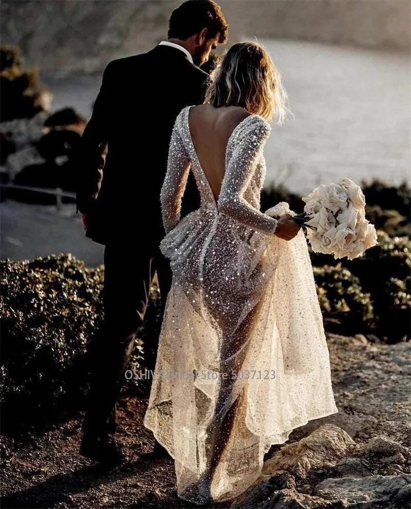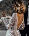 Mordern V- Neck Sequins Wedding Dresses Long Sleeves Floor Length Backless Bridal Gowns Robe De Marié