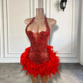 New Sparkly Rhinestone Luxury Red Diamond Women Birthday Gowns Halter Style Red Feather Black Girls Short Prom Dresses 2023
