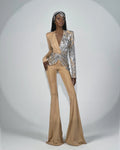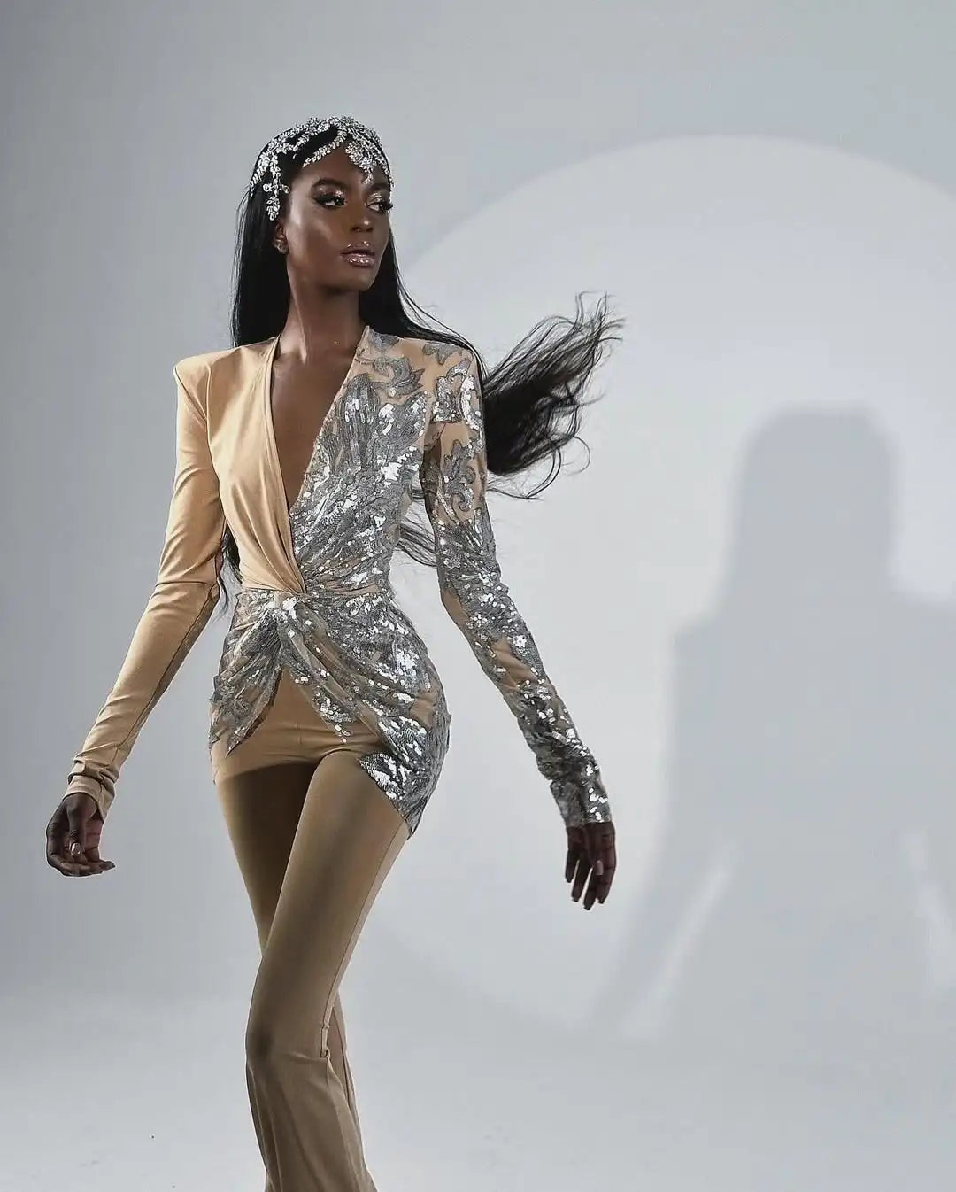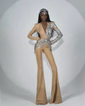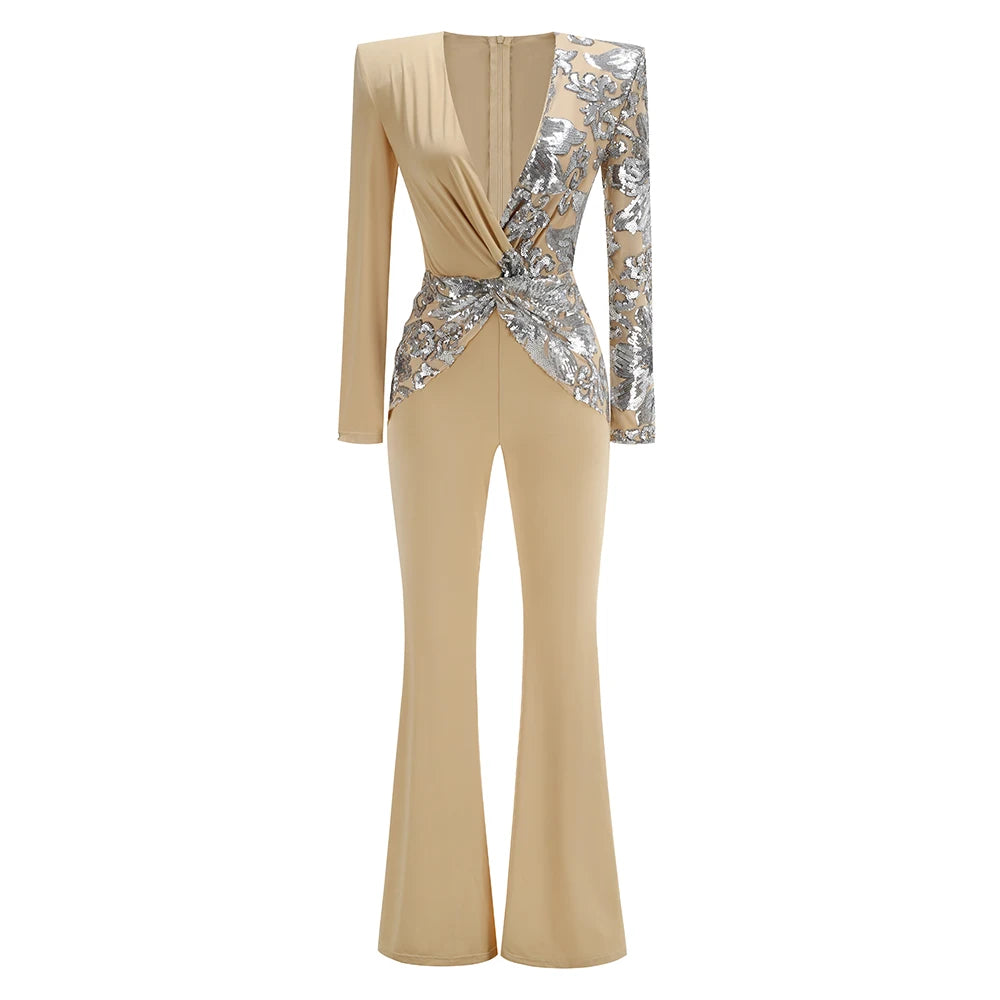 New Style Runway Fashion Khaki Color Women Long Sleeve Sexy V-Neck Sequins Bodycon Long Jumpsuit Celebrate Nightclub Party Wear