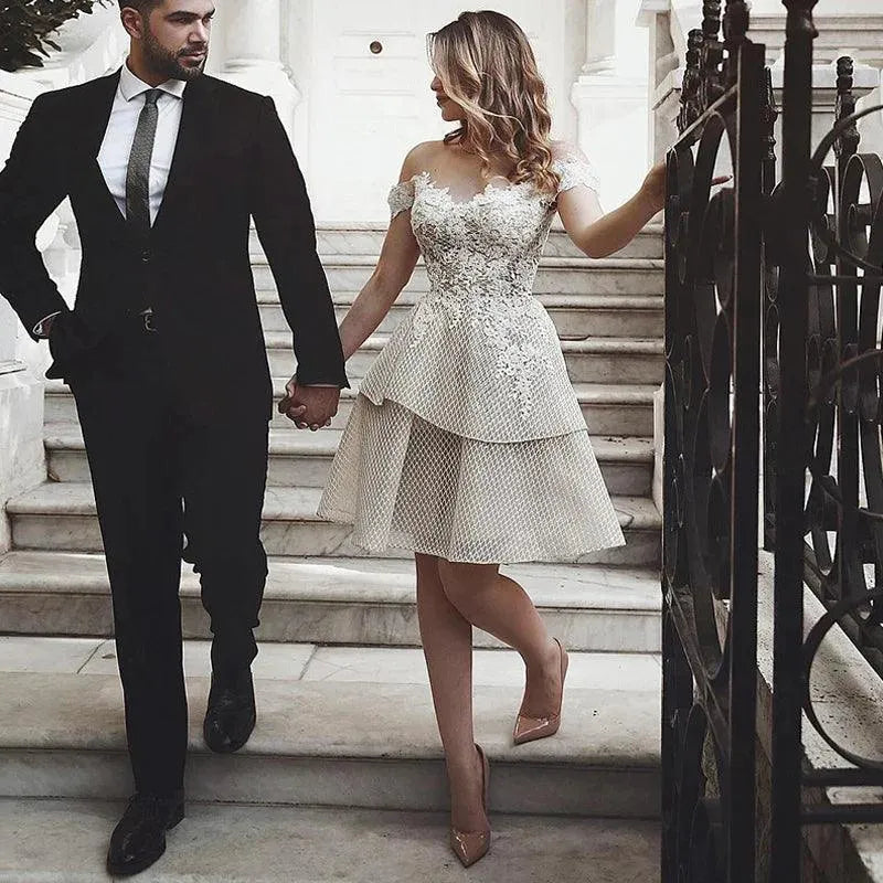 Off The Shoulder Short Wedding Dress Champagne Appliqued Lace Bride Dresses Knee Length Backless Wedding Gowns Custom