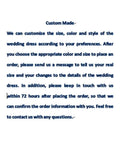 All of our dresses are meticulously handmade and made-to-order, tailored specifically to your preferences. This means that once your order is placed, it is crafted uniquely for you. As a result, we are unable to accept returns or exchanges for these items. Please note that we ship quality-controlled dresses without any damage. Any damages occurring during try-on or alterations are not our responsibility. Our commitment to creating personalized, high-quality garments ensures that each piece is crafted with care and attention to detail, tailored to your specifications.