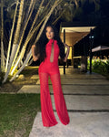 Red Khaki Color Women Sexy Strapless Mesh Florals Deep V-Neck Straight Long Jumpsuit Celebrate Nightclub Party Birthday Jumpsuit