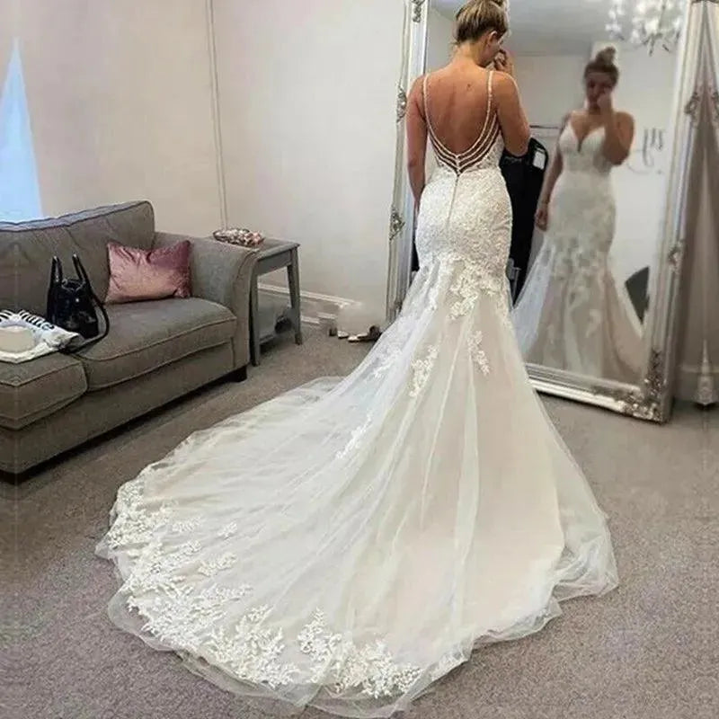 Sexy Deep V-Neck Wedding Dress Spaghetti Straps Lace Appliques Beach Mermaid Bride Gown Backless Train Vestido De Novia
