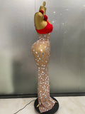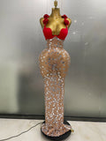 Sexy Sparkly Rhinestones Mesh Mirrors Red Roses Long Dress 2025 New Women Elegant Evening Party Club Stage performance Costume