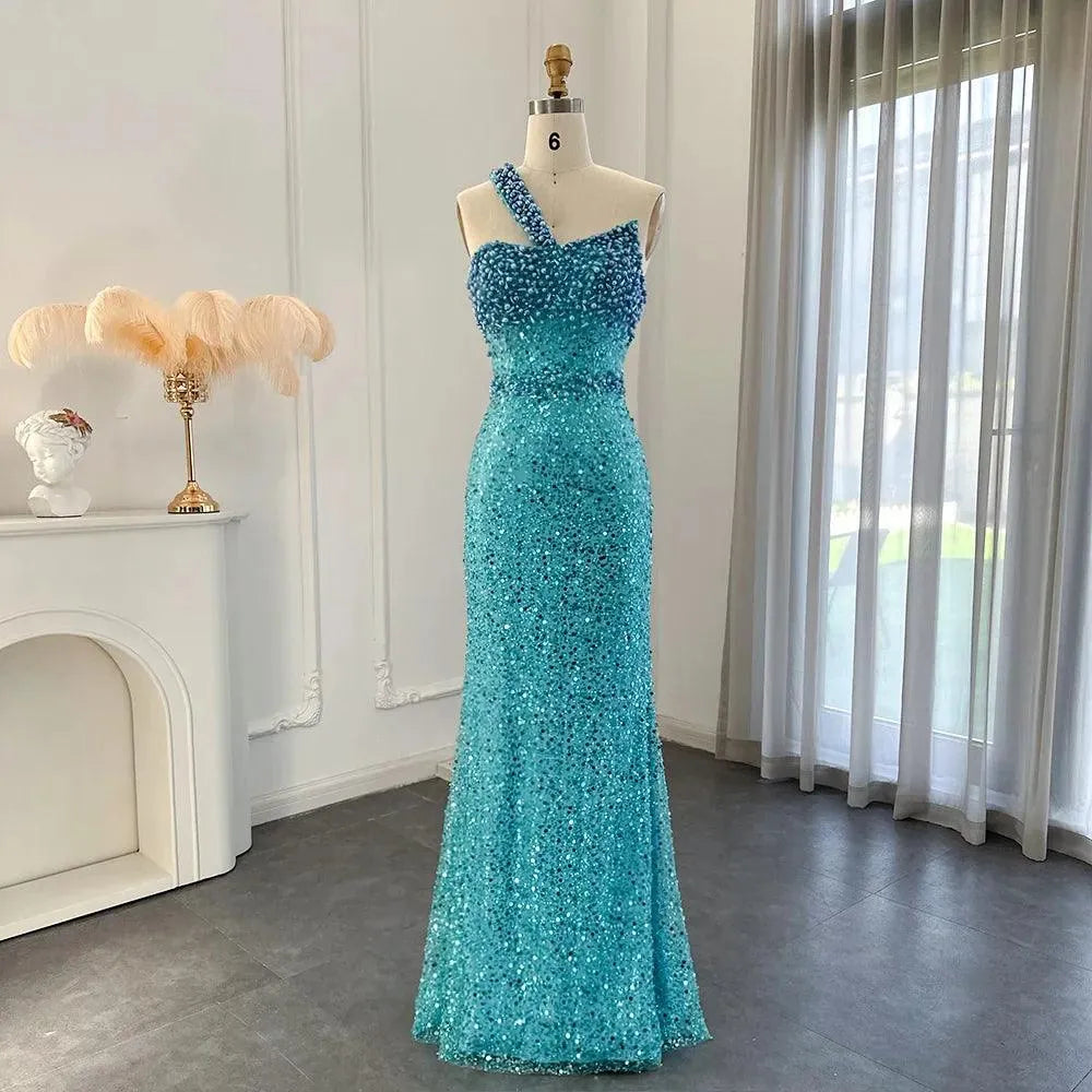 Luxury Dubai Turquoise Blue Mermaid Evening Dresses for Women Wedding One Shoulder Arabic Formal Party Gowns SS336