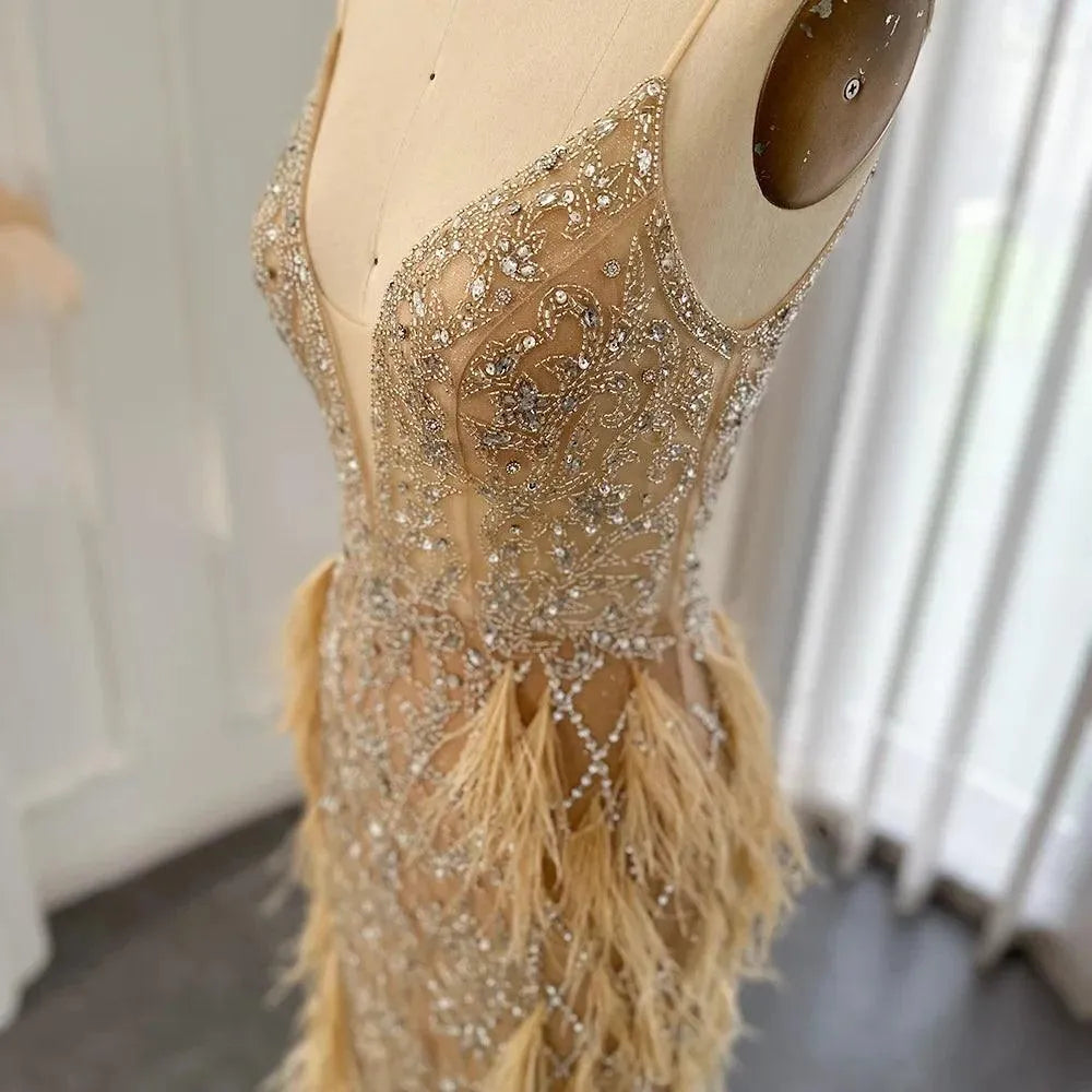 Luxury Feathers Mermaid Champagne Evening Dresses for Women Wedding Spaghetti Straps Blue Prom Formal Gowns